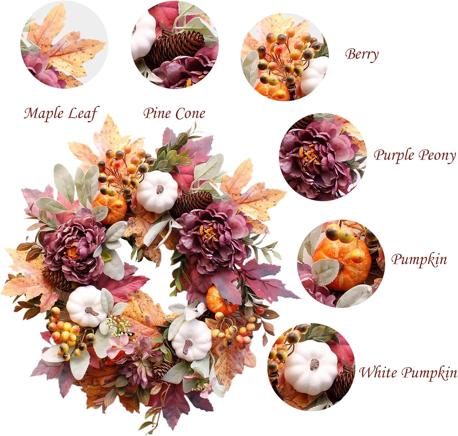 - 【Fall Wreath】- Our fall wreath for front door is handcrafted which is made of artificial white pumpkins,dark purple peony,pine cones and colorful maple leaves. The peony fall wreath is made of artificial silk flowers not plastic,which looks more realistic and bright.