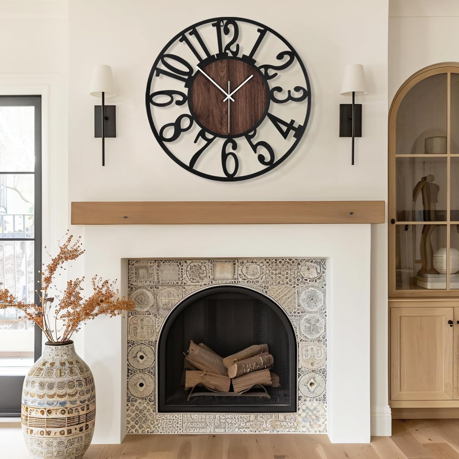 Maxstar Round Wall Clock for Living Room Decor Battery Operated Non Ticking Silent Vintage Black Metal Wood Clocks for Home Living Room Garden Farmhouse Office Kitchen Decoration -13 inch