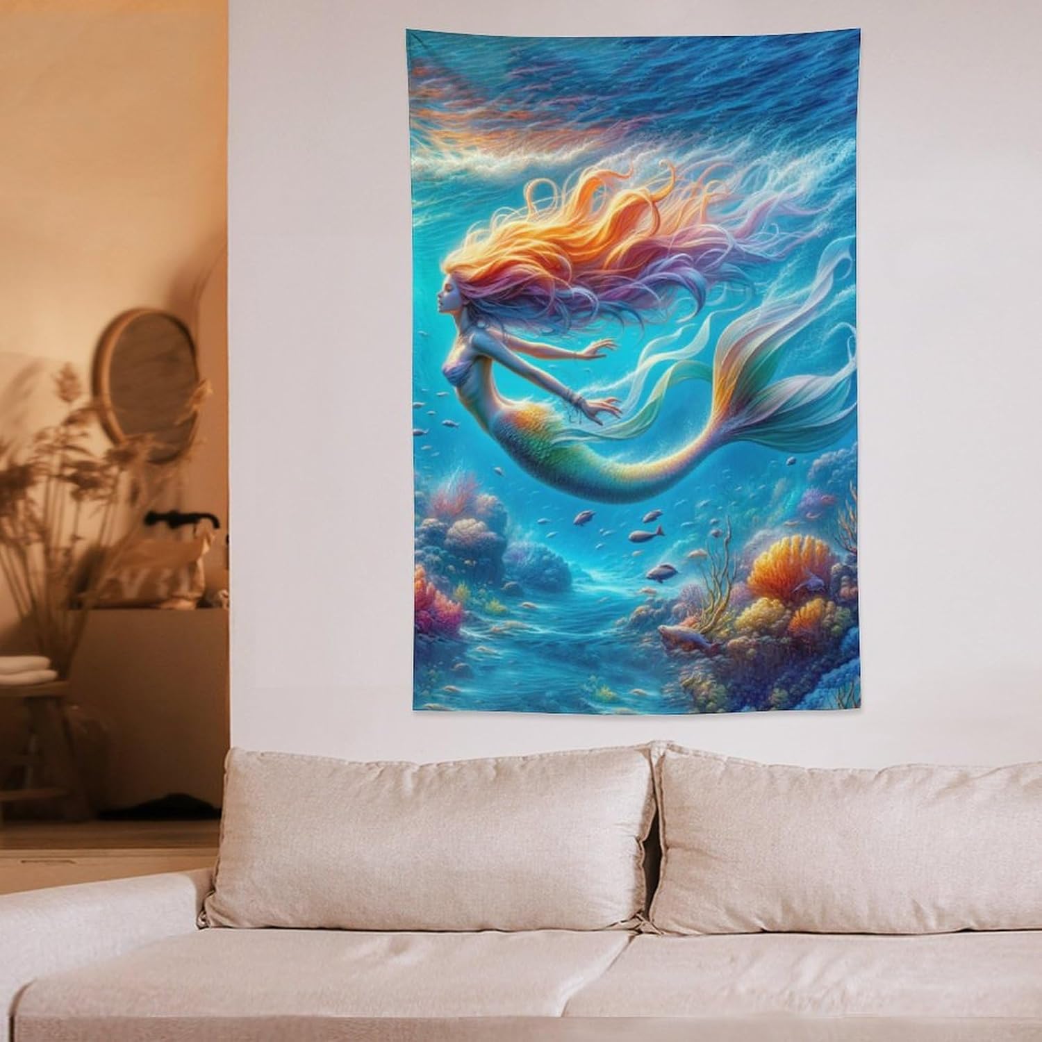 Mermaid Tapestry Ocean Tapestries Coastal Fabric Wall Hanging Aesthetic Space Indoor Outdoor Wall Art Tablecloth Bedspread Decoration for Girl’s Bedroom Dormitory Living Room Home Decor 40"x60"