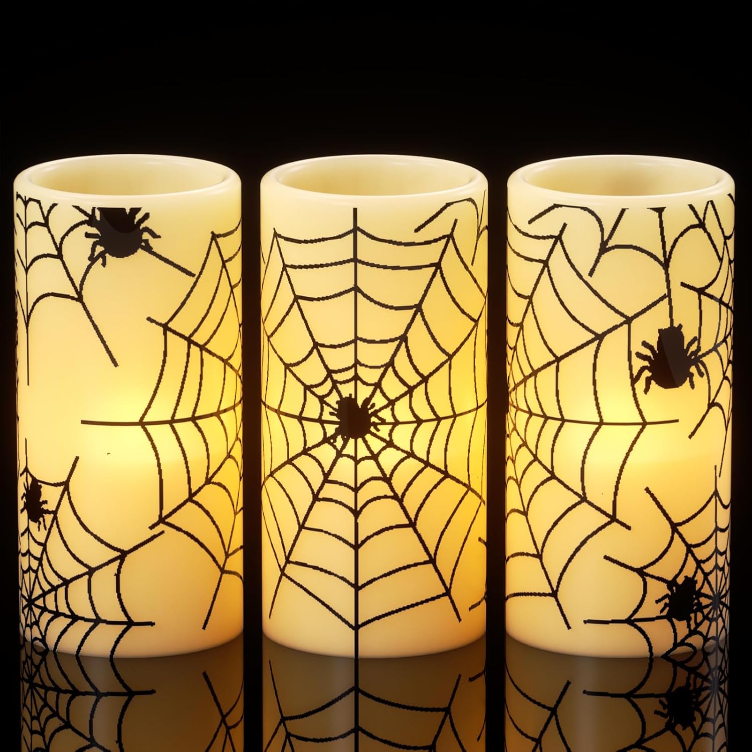 Wondise Halloween Flickering Flameless Candles with Spider Decals, Battery Operated Candles with 6hrs Timer, Real Wax Halloween LED Candles for Horror Spooky Halloween Home Decoration(Set of 3, 3"x6")