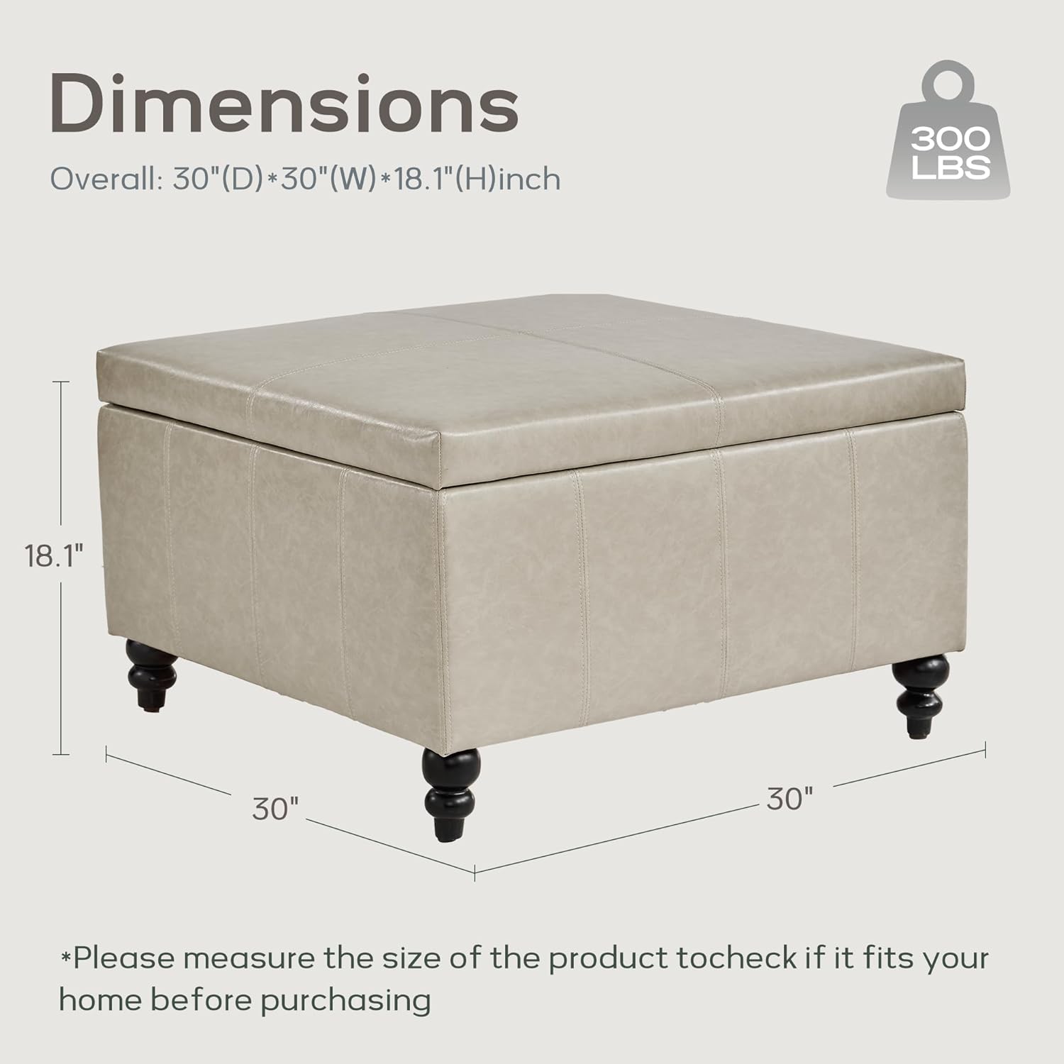 - LARGE CAPACITY: The large square storage ottoman bench measures 30" D * 30" W * 18" H. The large capacity ottoman can be used as blanket storage, foot stool, toy chest, and other items. It can also be used as a ottoman coffee table to provide more convenient space for your living room