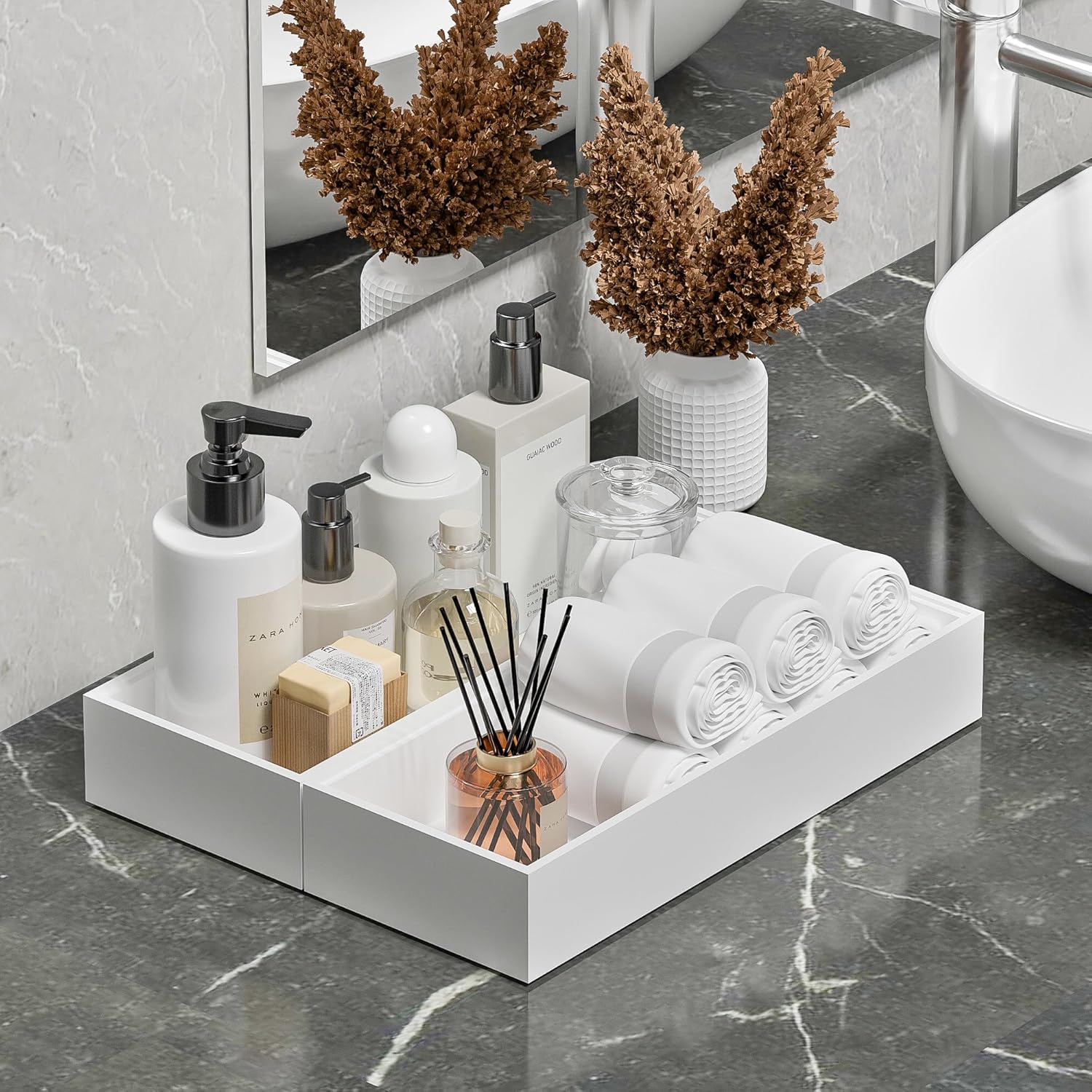 - Stackable and Deep Drawer Organizer Bins - Greatseas bathroom tray features 2.5" in height, which gives you more space to storage your guest towel, toilet paper roll, makeup and perfume. With groove design, our toilet paper storage basket can be stacked as needed. Its deep compartmentments and stackable design make it a practical storage box for drawers or even countertop, protecting your item from falling