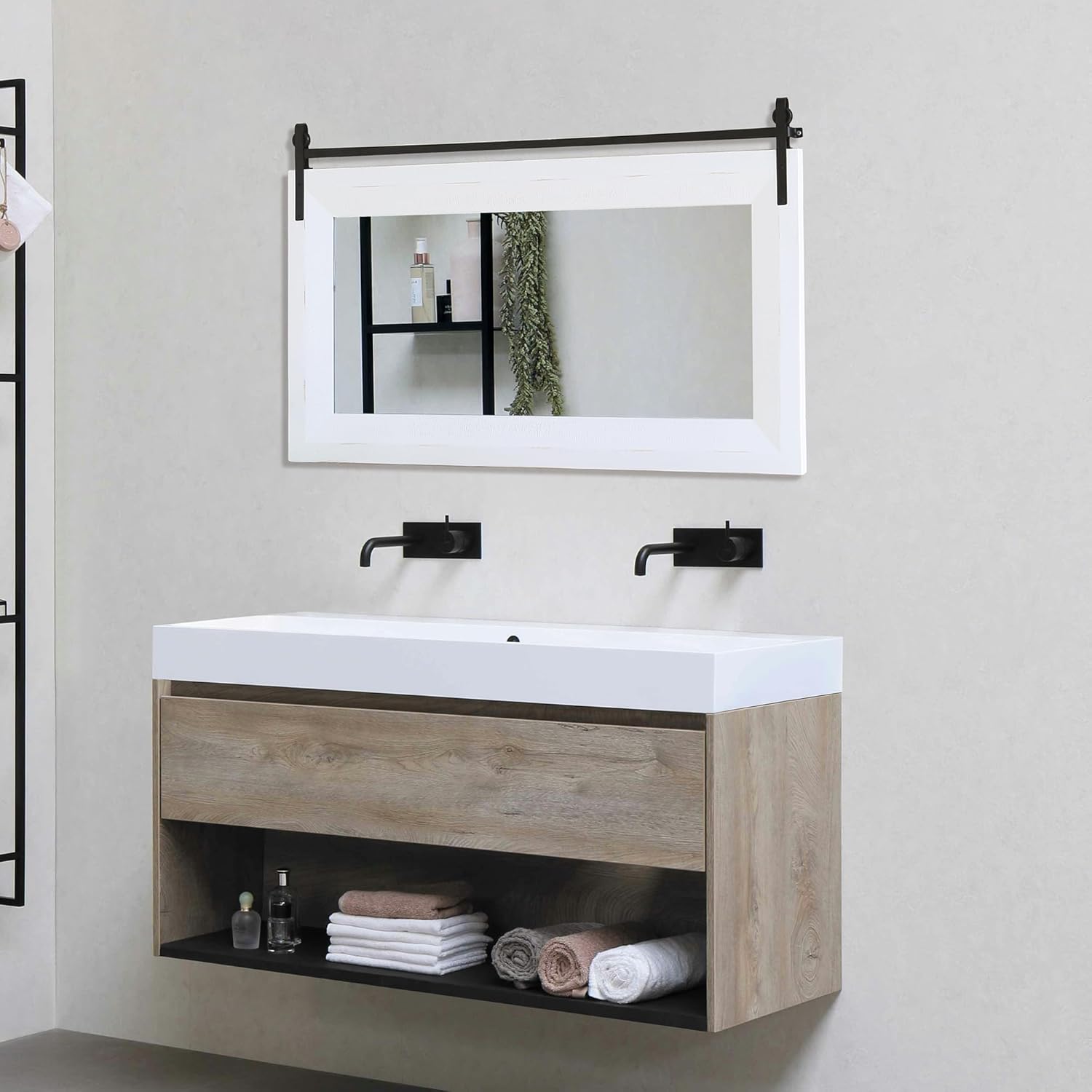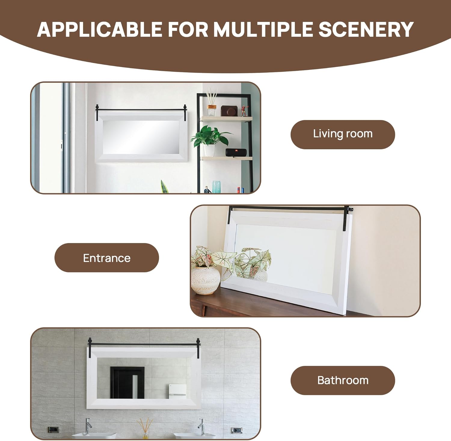 - 【Premium Solid Wood Frame】The frame of the farmhouse mirror is made of premium fir wood with oil-based paint to prevent scratches and ensure durability and resistance to moisture. The solid wood frame gives the rustic mirror a sturdy and authentic look, adding a touch of farmhouse appeal to the bathroom, living room, powder room, entryway, hallways, bedroom, dressing room, garden, courtyard, etc.