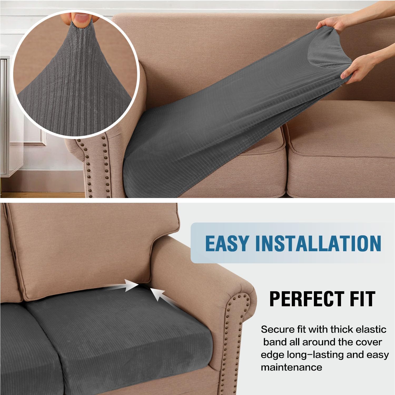 - STAY IN PLACE: Featuring non-skid thick elastic bottom, our cushion slipcover can stay tight with no snag, no wrinkling, shifting or slipping on both leather and cloth sofa. Check the installation guide carefully, it can be finished within 3 minutes by one person. It is very easy to put on and take down. (Installation Instructions Included)