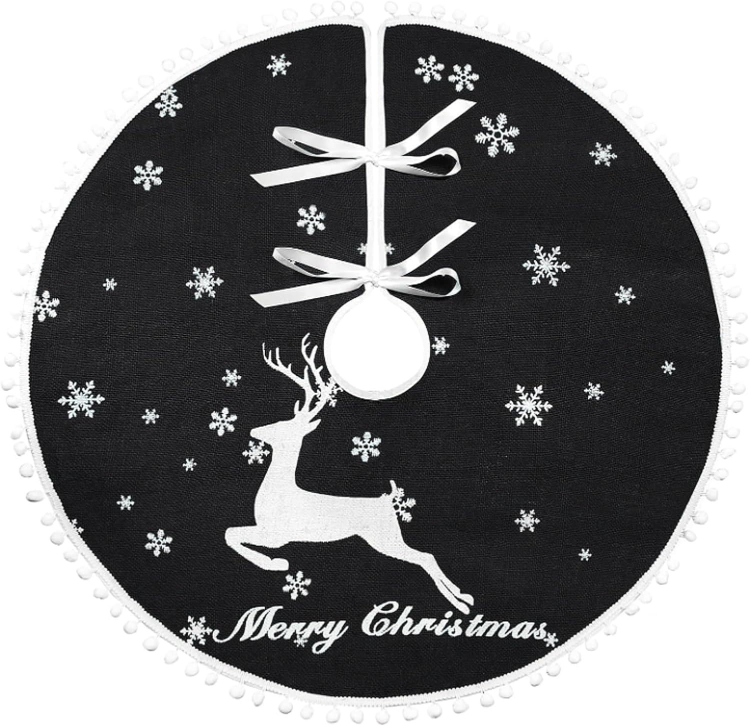 48 Inch Christmas Tree Skirt, Burlap Black Christmas Rustic Tree Skirt with Elk Deer and White Snowflake Printed for Holiday Party Xmas Tree Decoration