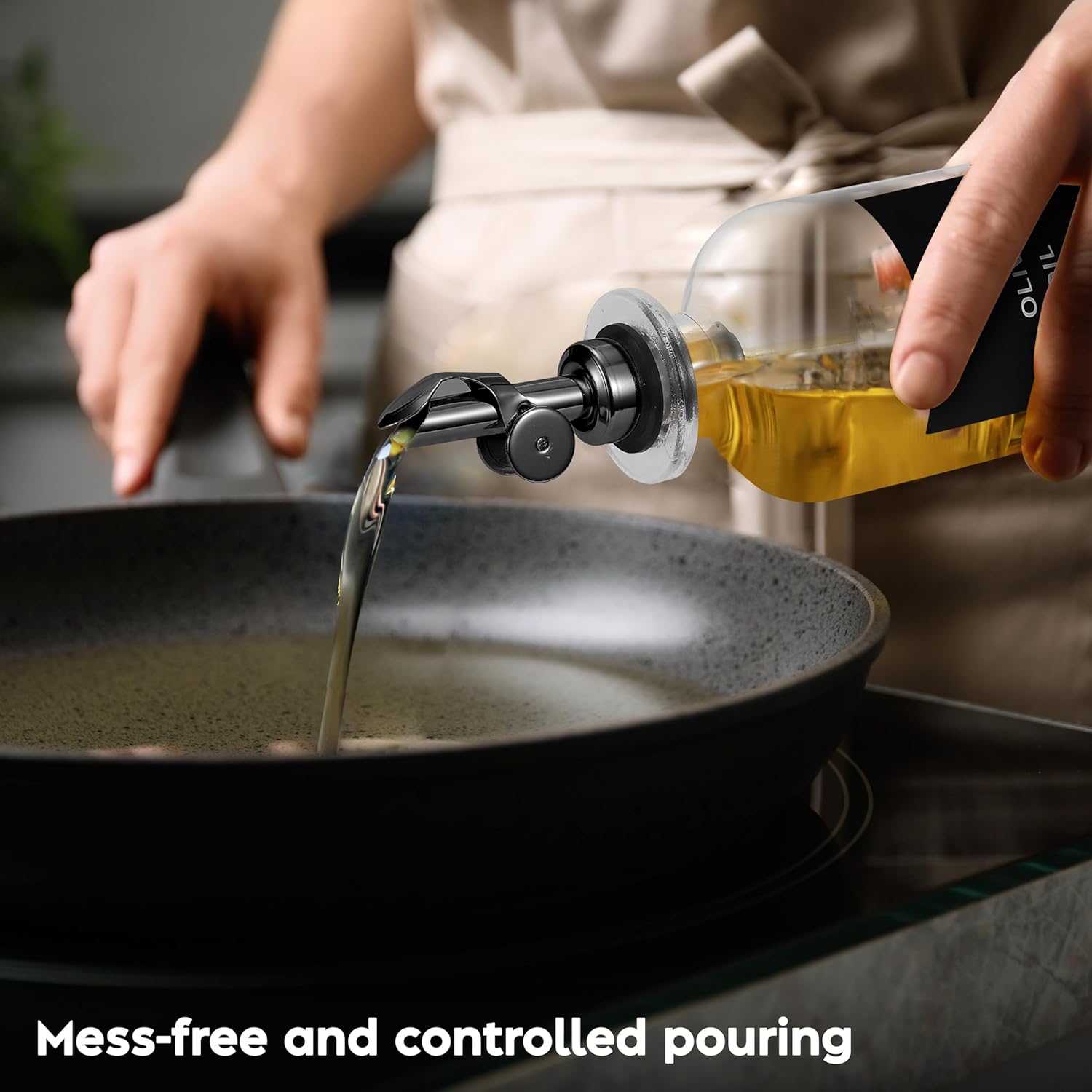 - Sealed Mess Free Pourer Spout — Spend more time enhancing your favorite meals with flavors and less time cleaning up thanks to the mess free tightly sealed black rubber stopper. This cooking oil dispenser bottle for kitchen has a pourer spout that will open and close when the bottle is tilted.