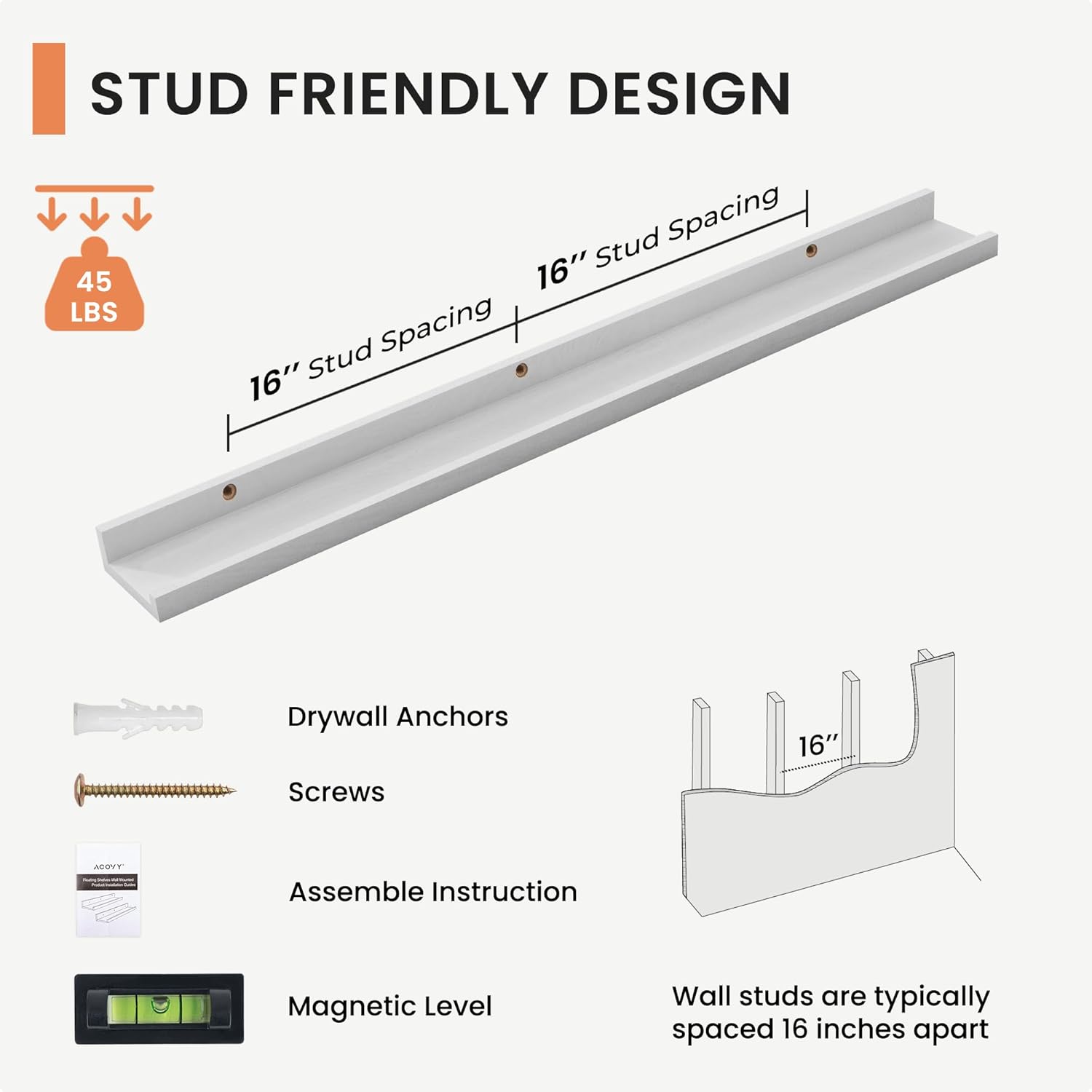 - Secure and Reliable: The mounting holes are expertly spaced at 16 inches to align perfectly with wall studs, ensuring a secure installation. Each wall shelf supports up to 45 lbs, This thoughtful design guarantees that your floating shelf with lip are anchored safely, offering stability and peace of mind for displaying any of your favorite items