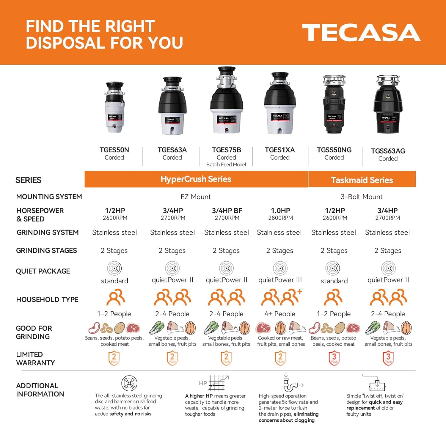 - 𝟏/𝟐 𝐇𝐏: The TECASA 1/2 HP garbage disposal is ideal for most home kitchens, fitting standard 3-1/2 inch sink openings. It comes with a pre-installed 39" power cord for quick and easy electrical connection. The compact, space-saving design features a DC motor that delivers instant, enhanced torque for efficient grinding operations.