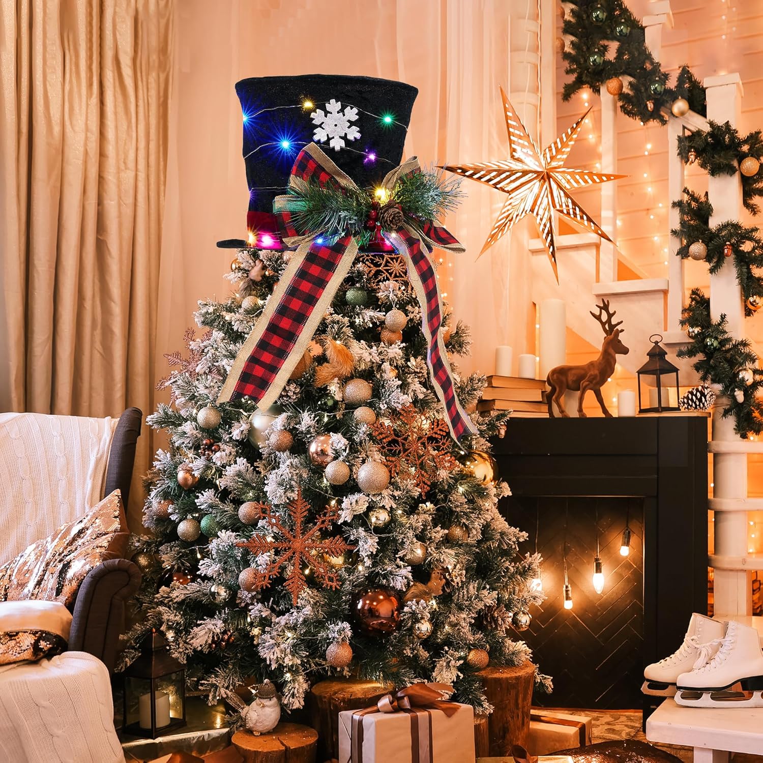- 【Versatile Holiday Decor】: This elegant hat is not just for the treetop; it can be creatively used as a snowman's hat during winter festivities or as a decorative piece in various spaces such as your room, kitchen, office, or as a centerpiece on your fireplace mantel, complementing a wide array of Christmas decorations.