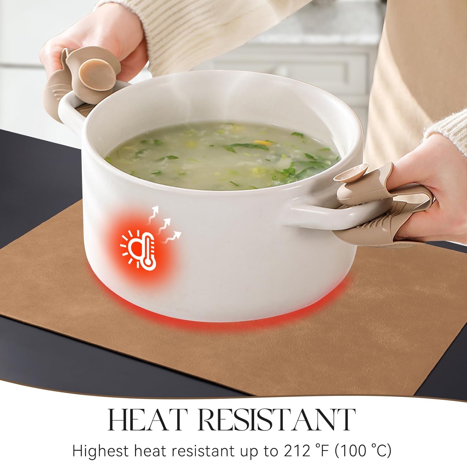- HASSLE-FREE CLEANING: Our faux leather placemats are designed to be 100% waterproof to better protect the table from grease and grime compared to woven and fabric placemats. If the placemats get stained with sauce or food residue, simply wipe with a cloth or rinse with water.