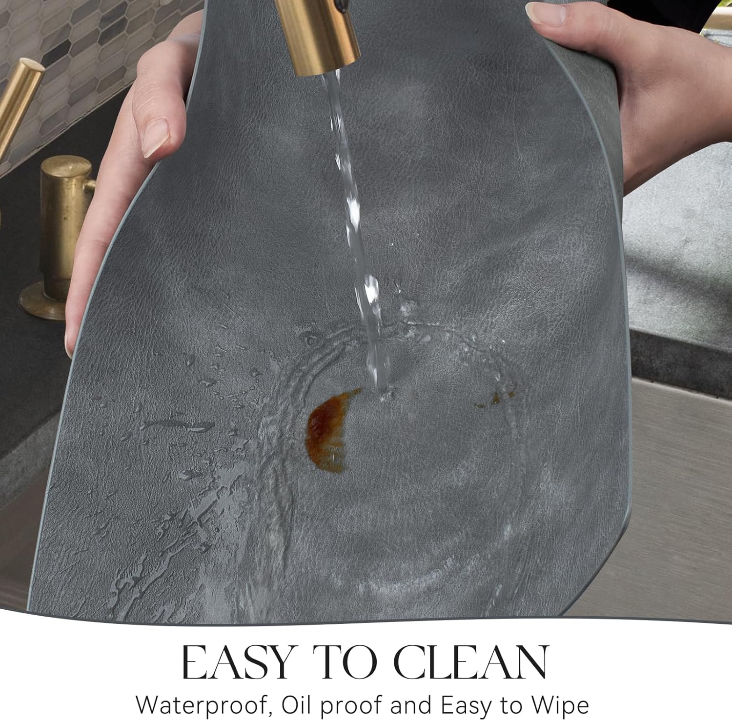 - HASSLE-FREE CLEANING: Our faux leather placemats are designed to be 100% waterproof to better protect the table from grease and grime compared to woven and fabric placemats. If the placemats get stained with sauce or food residue, simply wipe with a cloth or rinse with water.