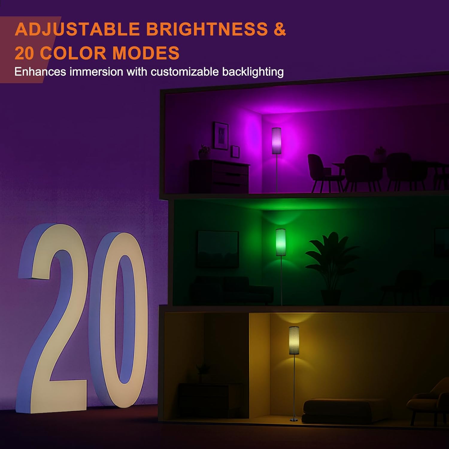 - 【Various use scenarios】This led bright floor lamp is perfect for creating a relaxing atmosphere for various activities. Whether you're hosting a get-together, enjoying a movie night, gaming, or reading, you can set the mood just right. The ability to customize the color and brightness allows you to tailor the lighting to fit any occasion, making it a versatile addition to any room.
