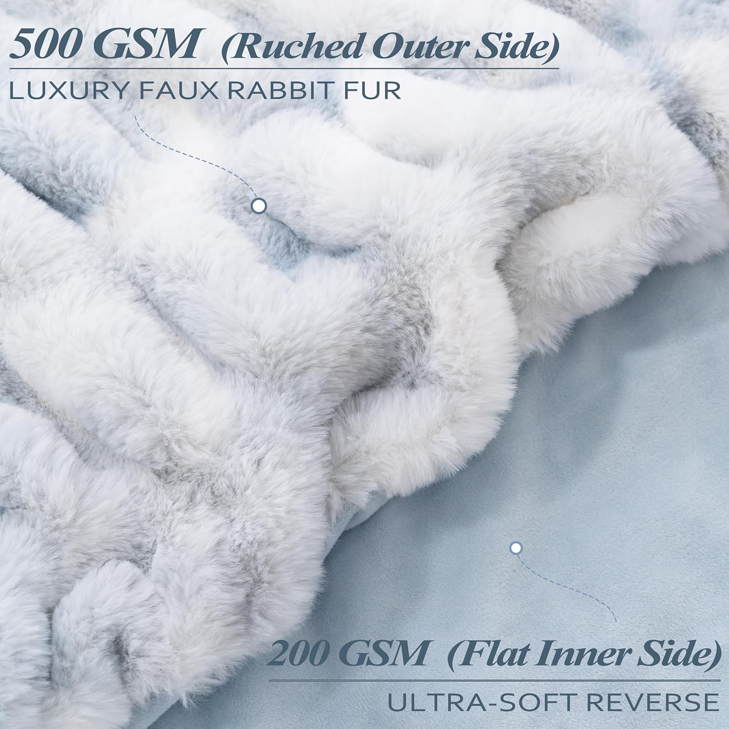- Luxurious Comfort and Design: Experience exceptional comfort with our faux fur blanket, featuring 500 GSM ruched faux rabbit fur on the outer side and 200 GSM ultra-soft flat inner side. The unique ruched design adds a touch of elegance and visual interest, making it a beautiful addition to room. Its plush texture provides a velvety feel that's irresistibly soft to the touch