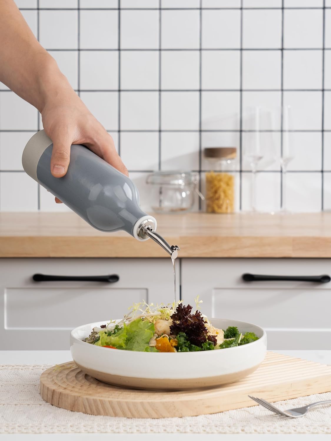 - ELEGANT OLIVE OIL DISPENSER BOTTLE - Our ceramic oil dispenser is handmade and batch fired at extremely high temperatures, forming a smooth glaze and providing a resilient surface for strength and durability, easy to clean and dishwasher safe for long-term use