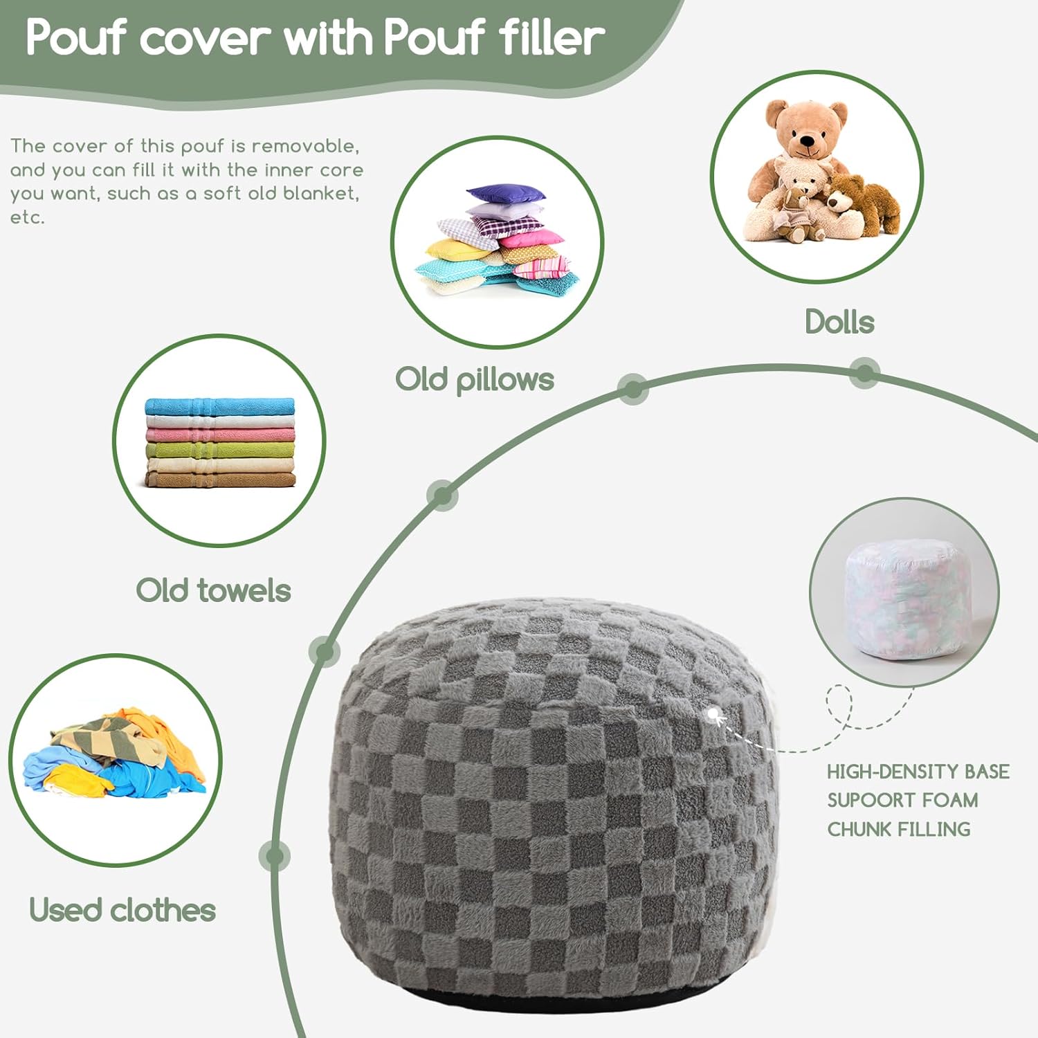 HIGOGOGO Round Stuffed Pouf Ottoman, Plaid Poufs with Foam Chunk Filling, Fluffy and Furry Pouf Foot Stool Storage Ottoman, 20 X 15 Floor Poufs Foot Rest for Living Room, Grey