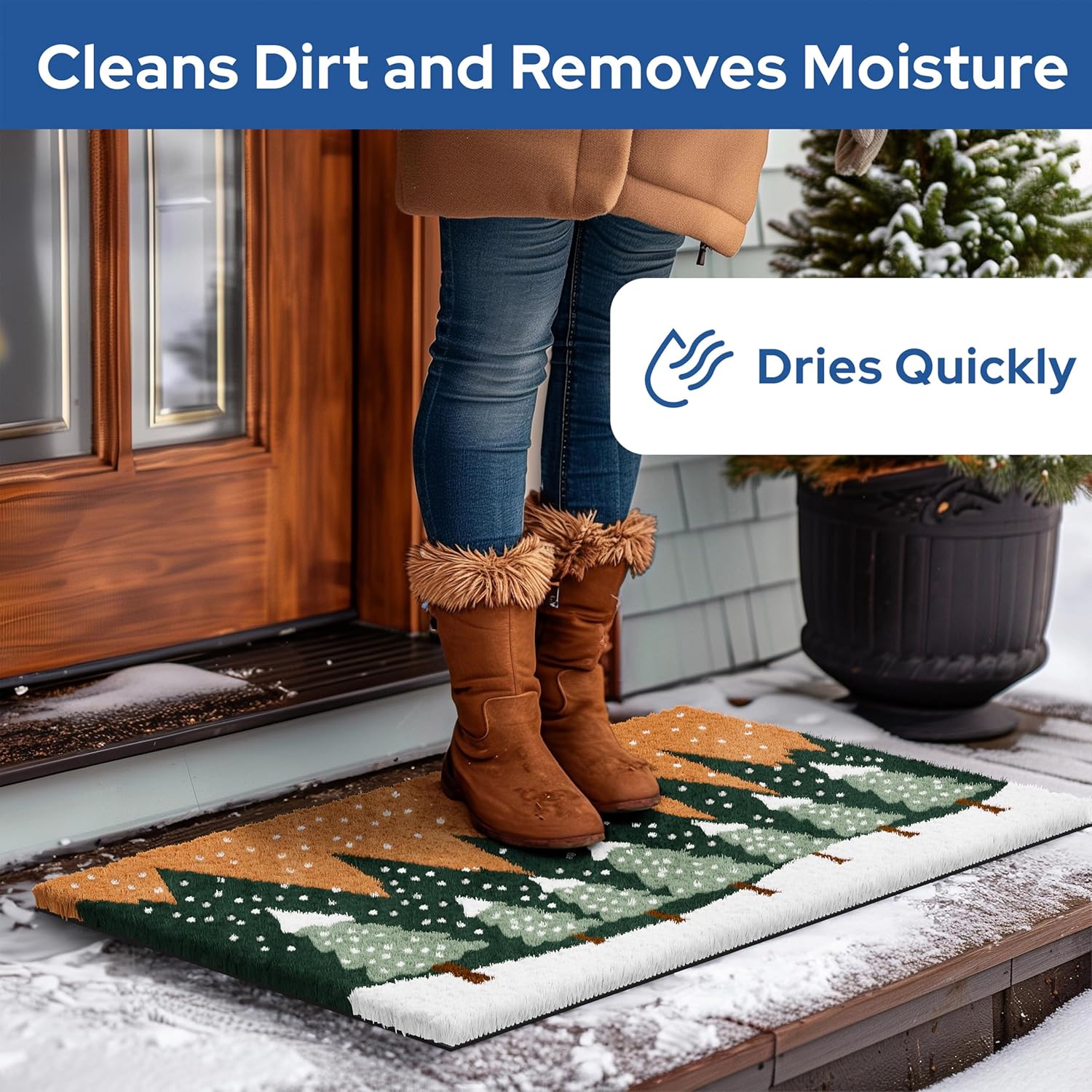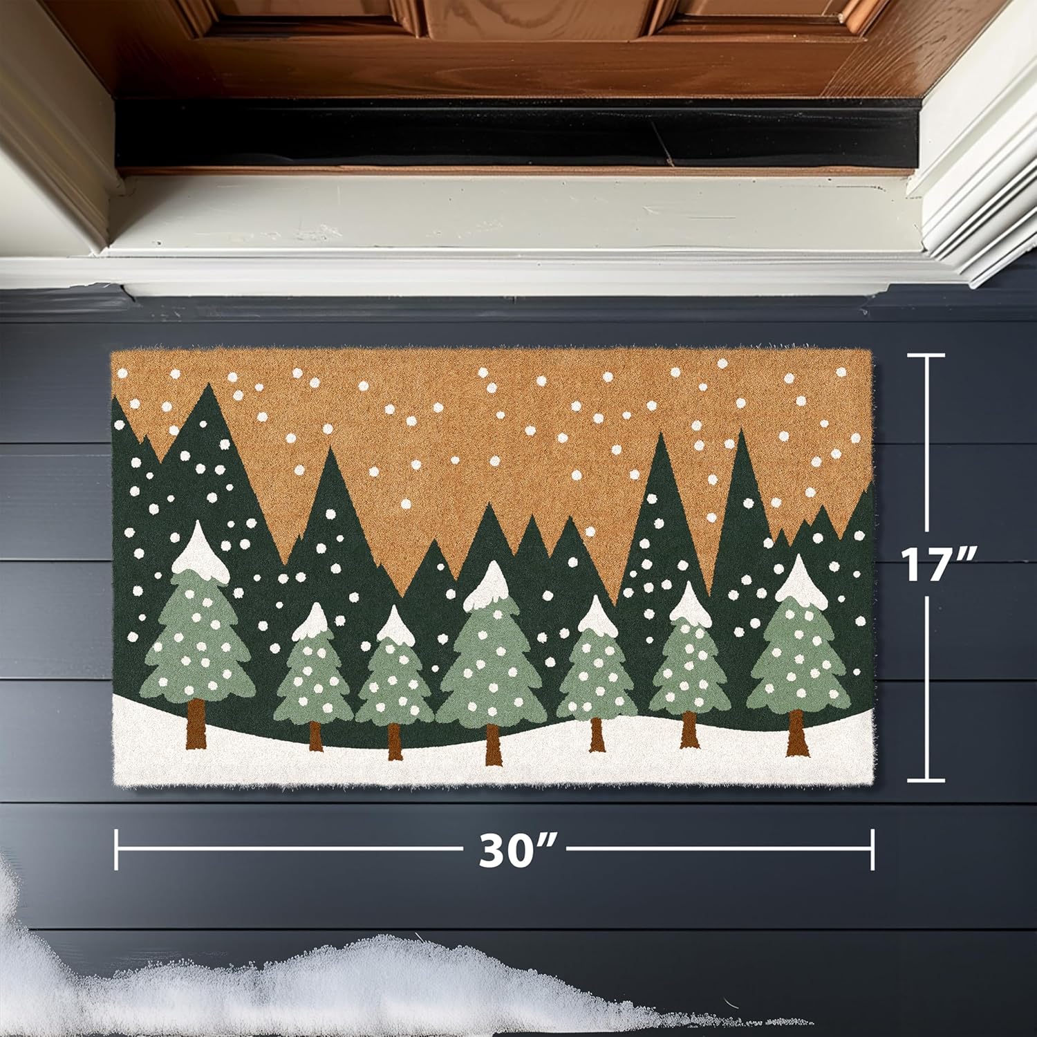 - Versatile - Our Winter Forest welcome door mat outdoor entrances is not only perfect for patios, but also makes a great welcome mat for outdoor events or camping trips. Its durable construction is perfect for cleaning dirt and debris from shoes, and the all-weather coir fibers dry quickly. Use it to welcome guests to your home, cabin, or RV.