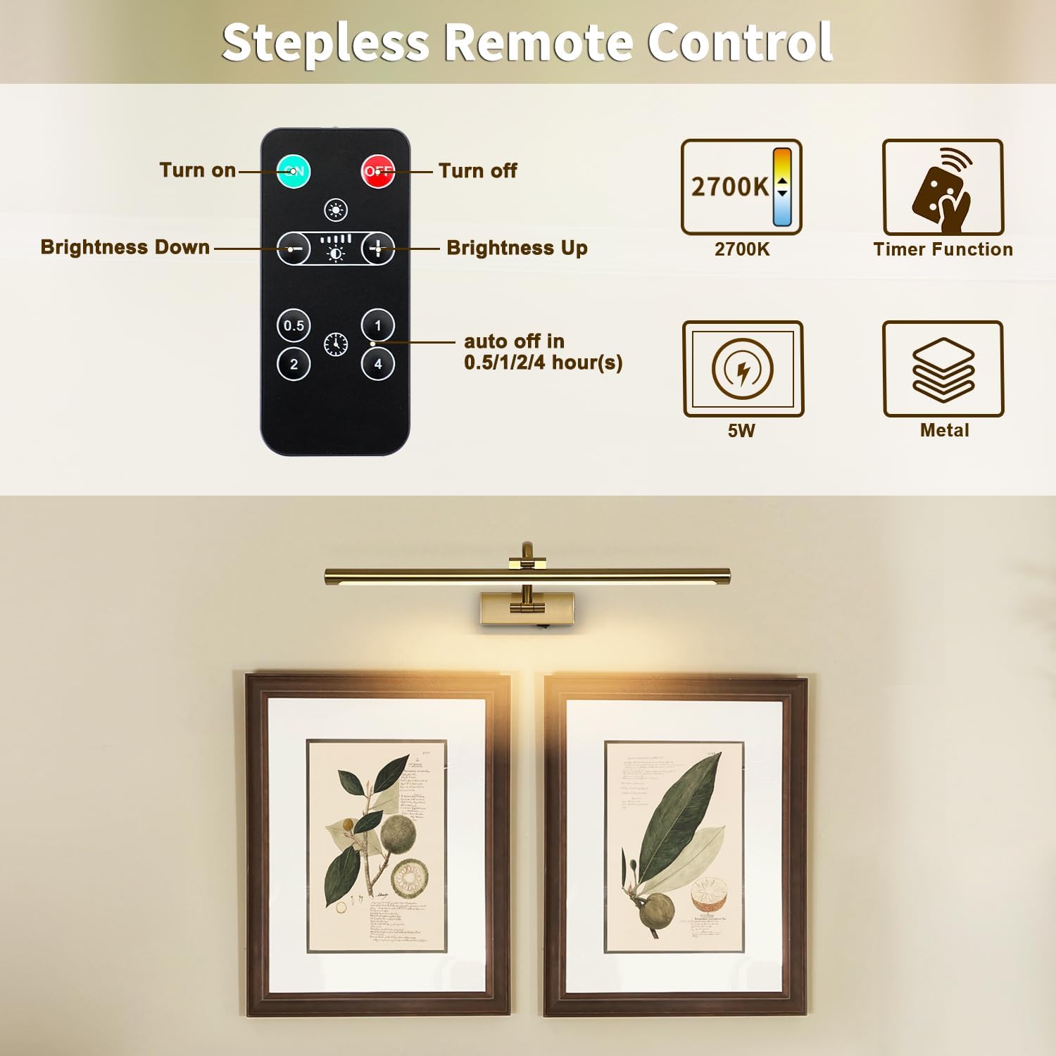 Wireless Picture Lights with Remote and Timer Rechargeable Brass Gallery Lighting Battery Operated Art Lights Over Frame Portrait 5W 24'' Inch Warm White