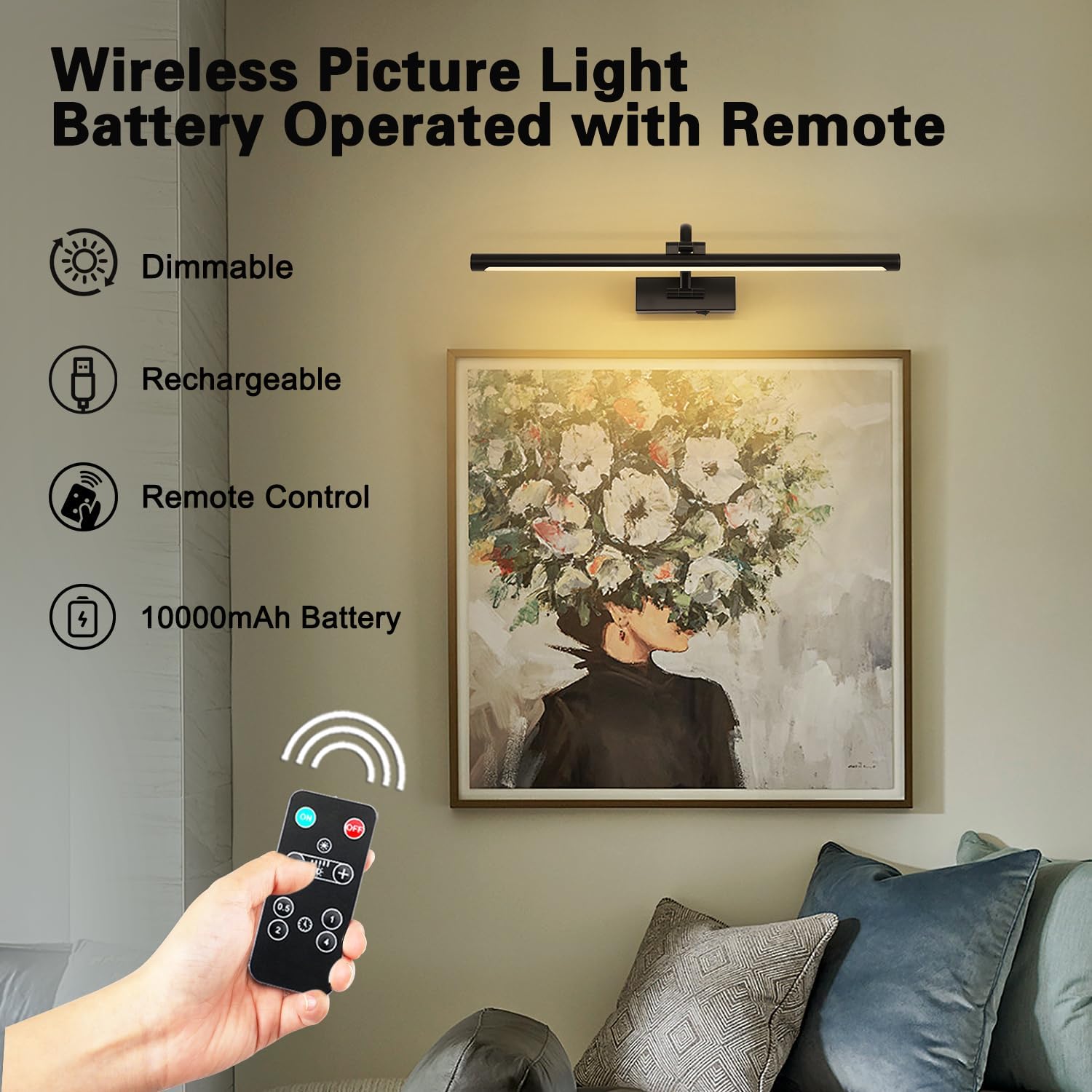 Dimmable Black Picture Lights with Remote and Timer Wireless Art Lights Rechargeable Gallery Lighting for Canvas Portrait 24'' Inch 5W Warm White