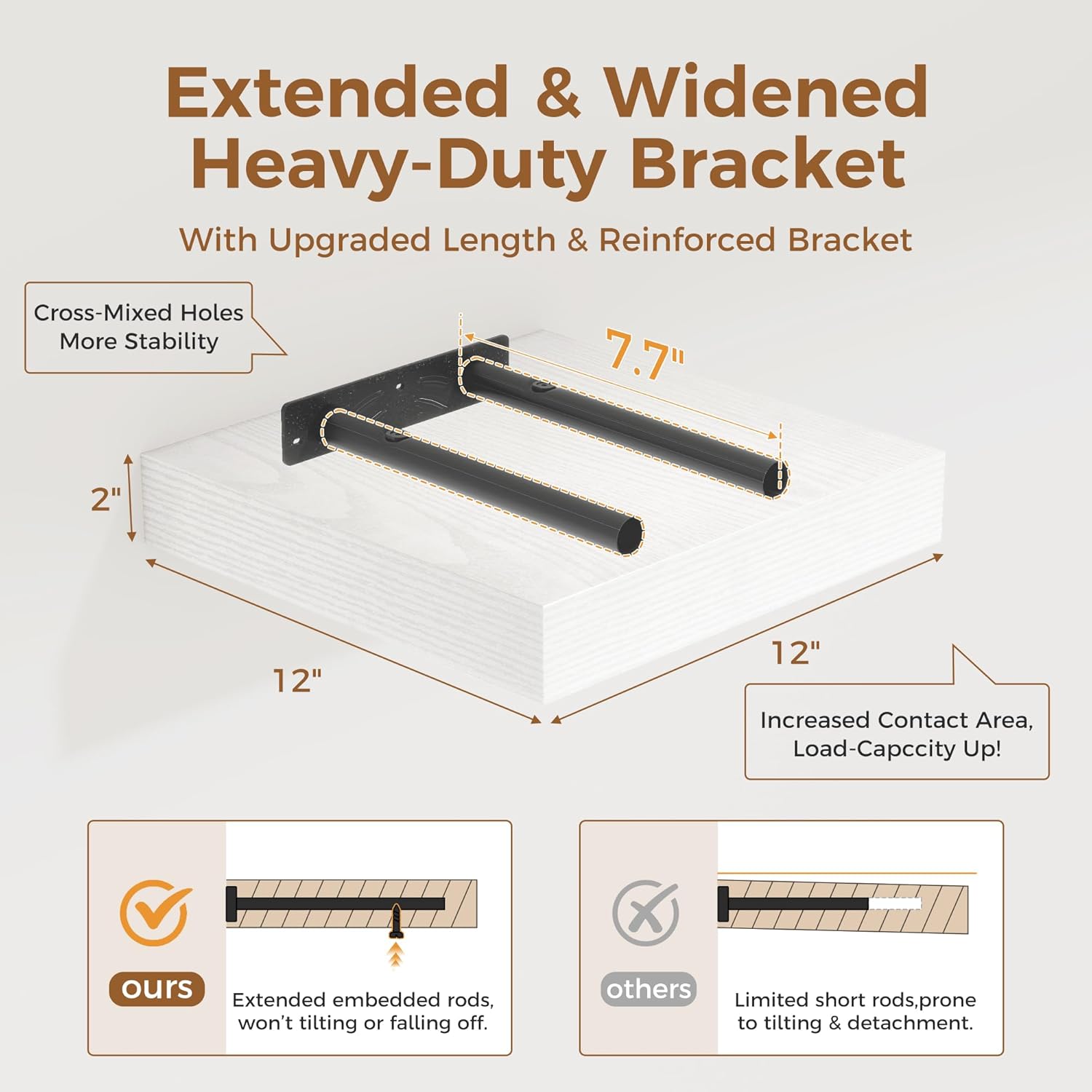 Fun Memories 12 Inch Floating Shelf, Rustic Wood Wall Shelves for Wall Decor & Storage, 12 x 12 Floating Shelf for Living Room, Bathroom, Bedroom, White, Set of 2