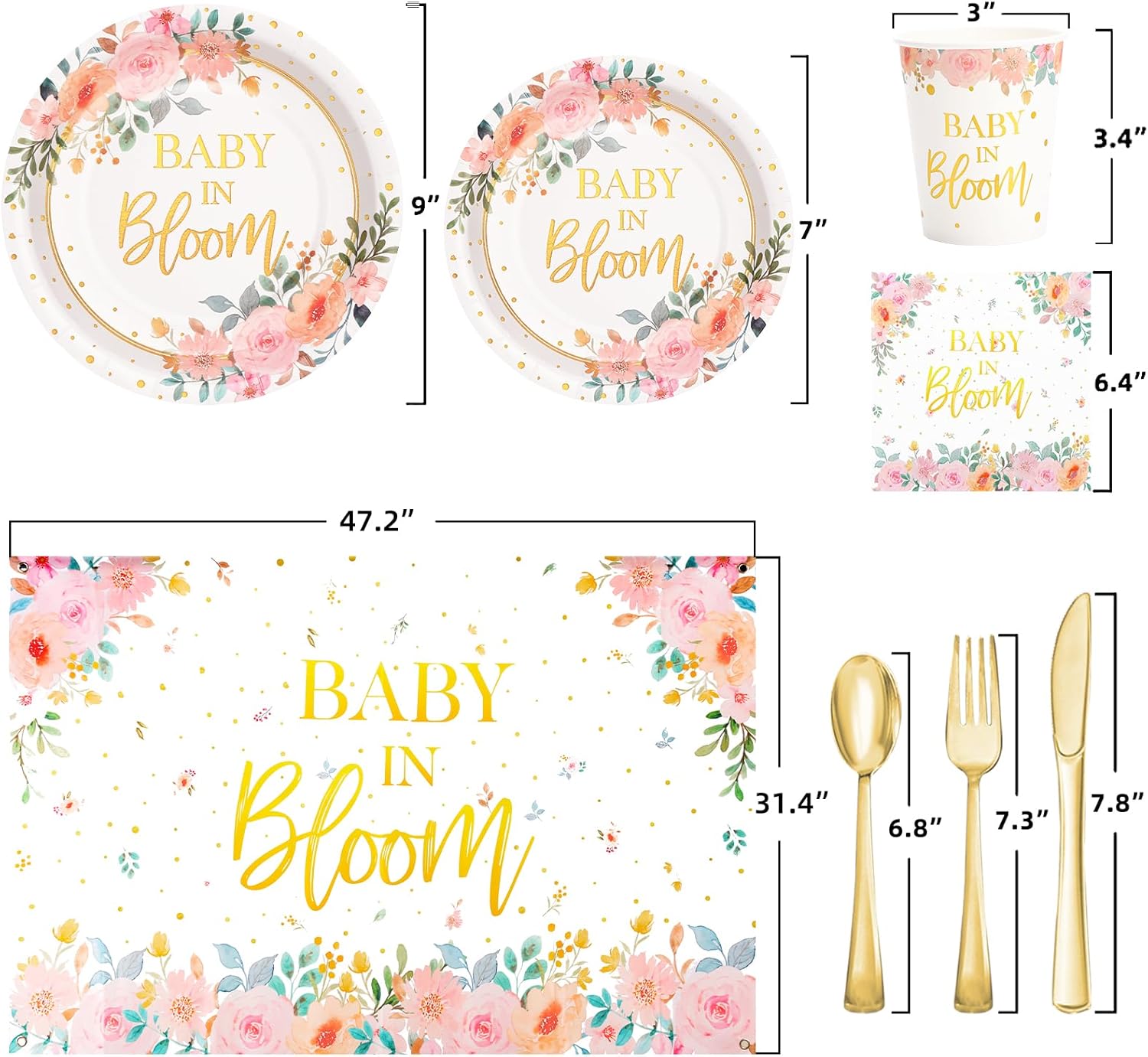 - 【Floral Baby Shower Decorations】This pink baby shower decorations for girl features pink flowers + sage green and "Baby in Bloom" gold dots design. The green and gold dots complement each other in the sun, emitting a dazzling glow. The sage green leaves and flowers and the elegant gold design create a very warm and soft baby shower plates and cups and napkins sets.