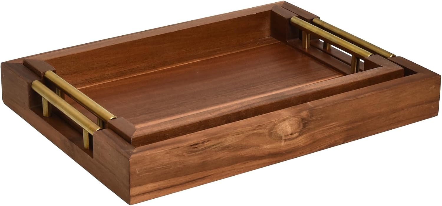 Set of 2 Acacia Wood Serving Trays with Gold Metal Handles for Food Serving, Appetizers & Snacks - Ideal for Bed, TV, Ottoman or Coffee Table Décor, Home Decoration Accessory 15.75x11.8 Inch