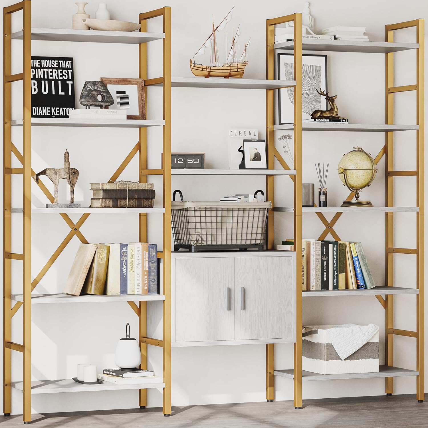Triple 5 Tier Bookshelf, Industrial Large Bookcase with Storage Cabinet, Tall Gold Bookshelf with 14 Open Display Shelves Metal Frame Furniture for Living Room Bedroom Home Office Gold & White