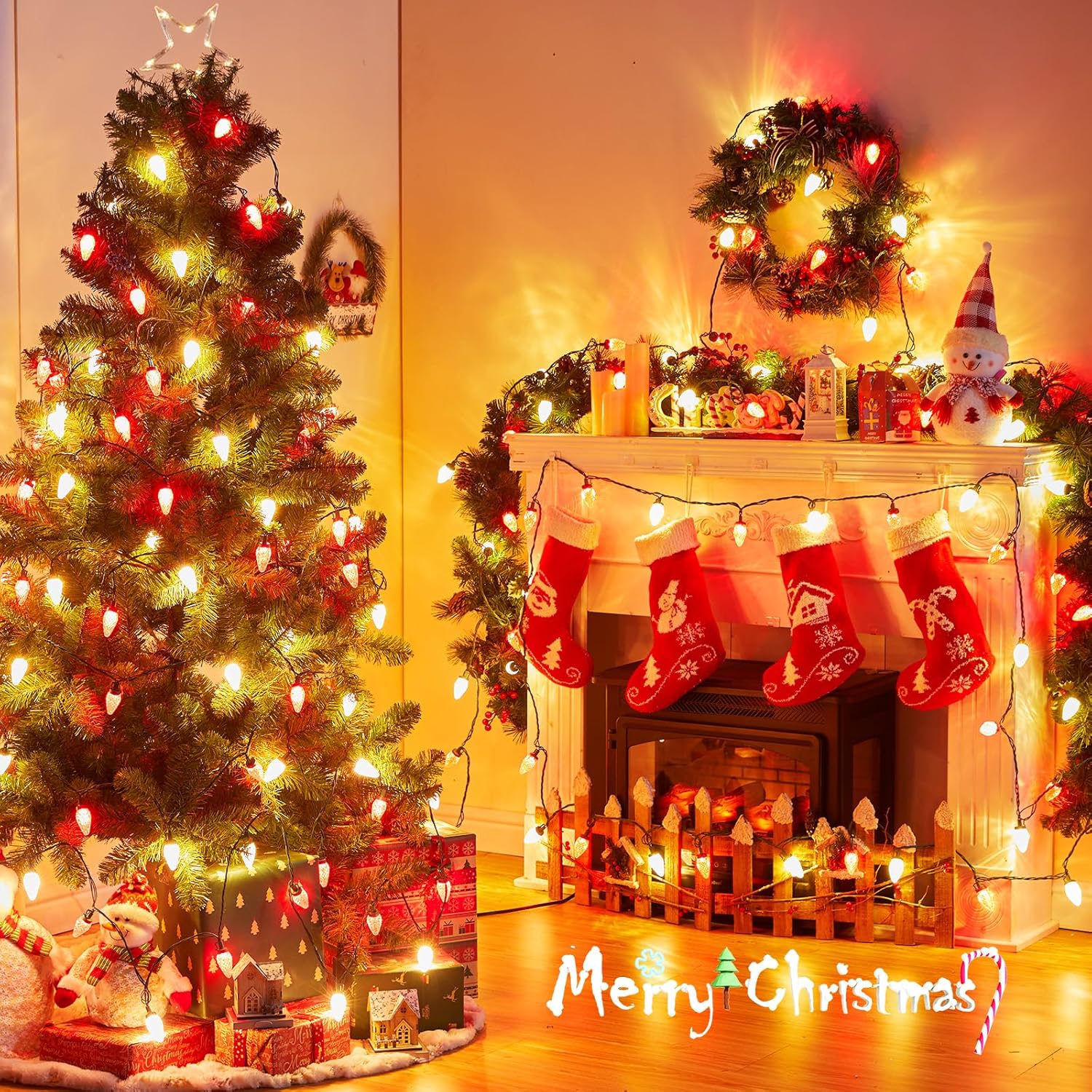 - Waterproof Outdoor Christmas Lights: IP44 waterproof, the popular Christmas C9 string lights can withstand all kinds of weather! Made from durable polycarbonate materials, these faceted C9 bulbs offer vibrant and long-lasting illumination without fading, cracking, or chipping. Suitable for outdoor and indoor decorations. Note: Please prevent the plug from being immersed in water.