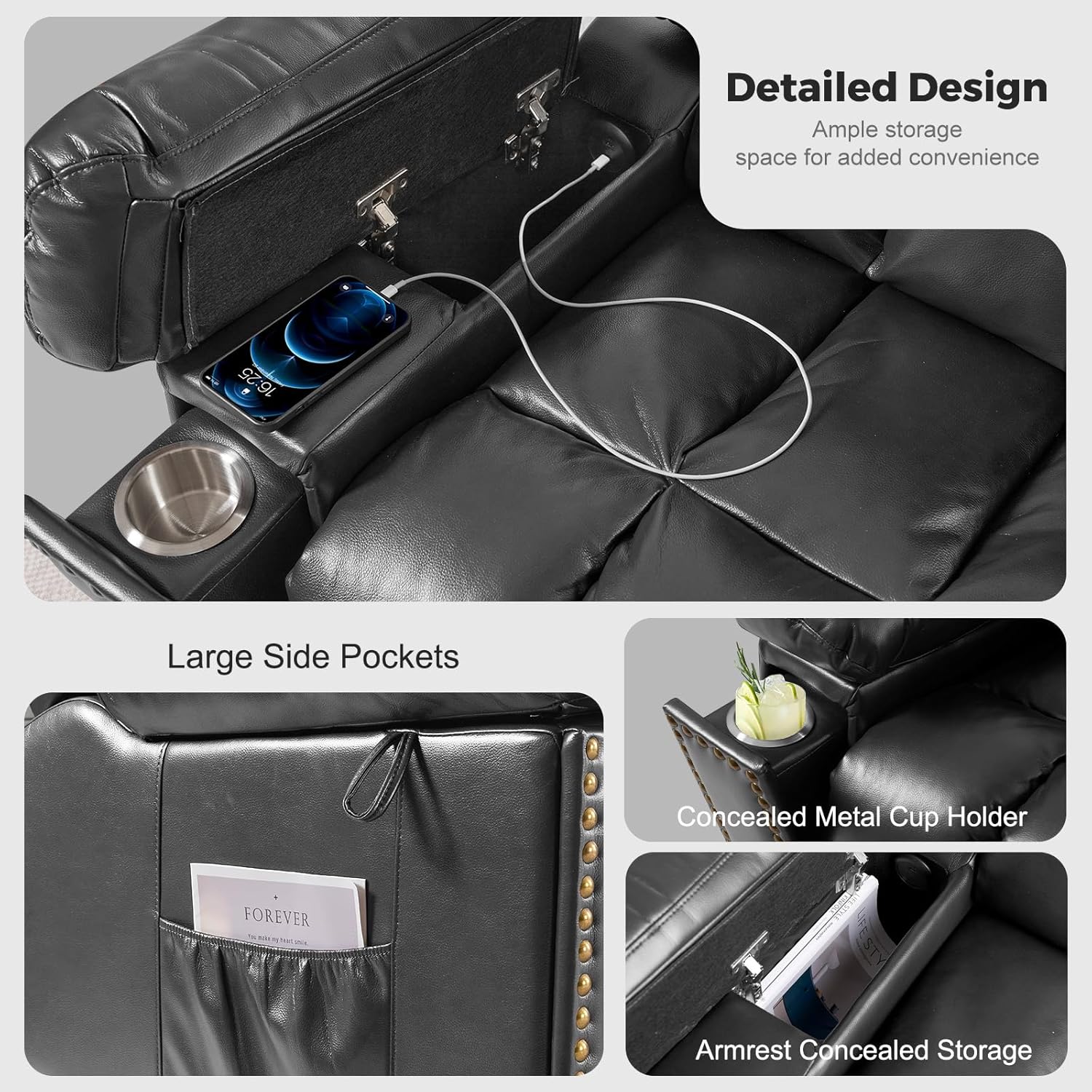 - 【Humanized Design】The armrests storage space and side pockets can be put some small items within reach, more convenient. 2 concealed cup holders offer you wonderful home theatering experience.Concealed USB & Type-C charging allows you to charge low-power devices from the comfort of your chair. The sturdy steel frame and high-density 26D foam cushion ensure both long-lasting comfort and support for a maximum weight of up to 350 pounds. Overall Size: 39.6"D x 38.5"W x 41.5"H