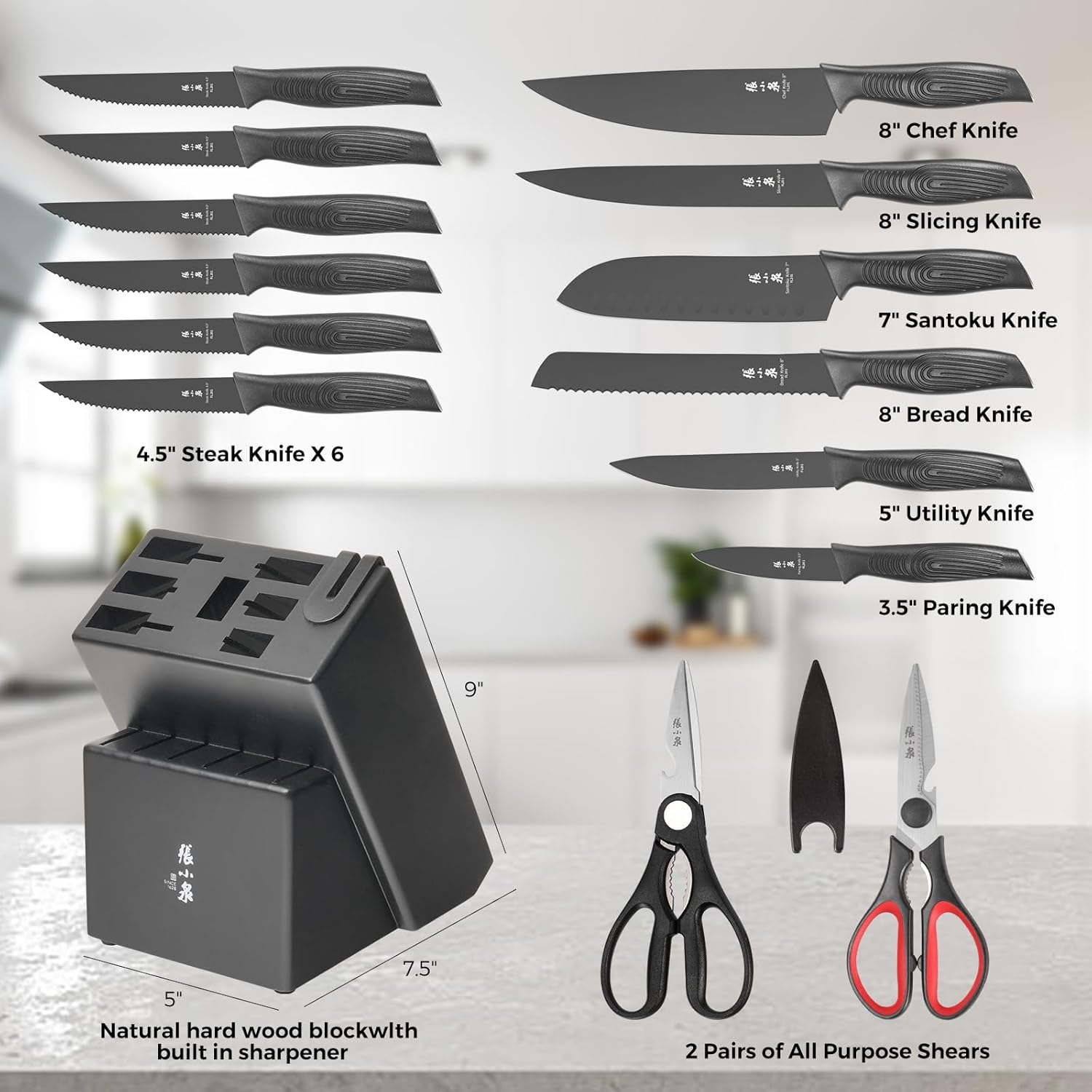 ZHANG XIAO QUAN SINCE 1628 15Pcs Knife Sets for Kitchen with Block,Knife Set with Built-in Sharpener Dishwasher Safe(Master A)
