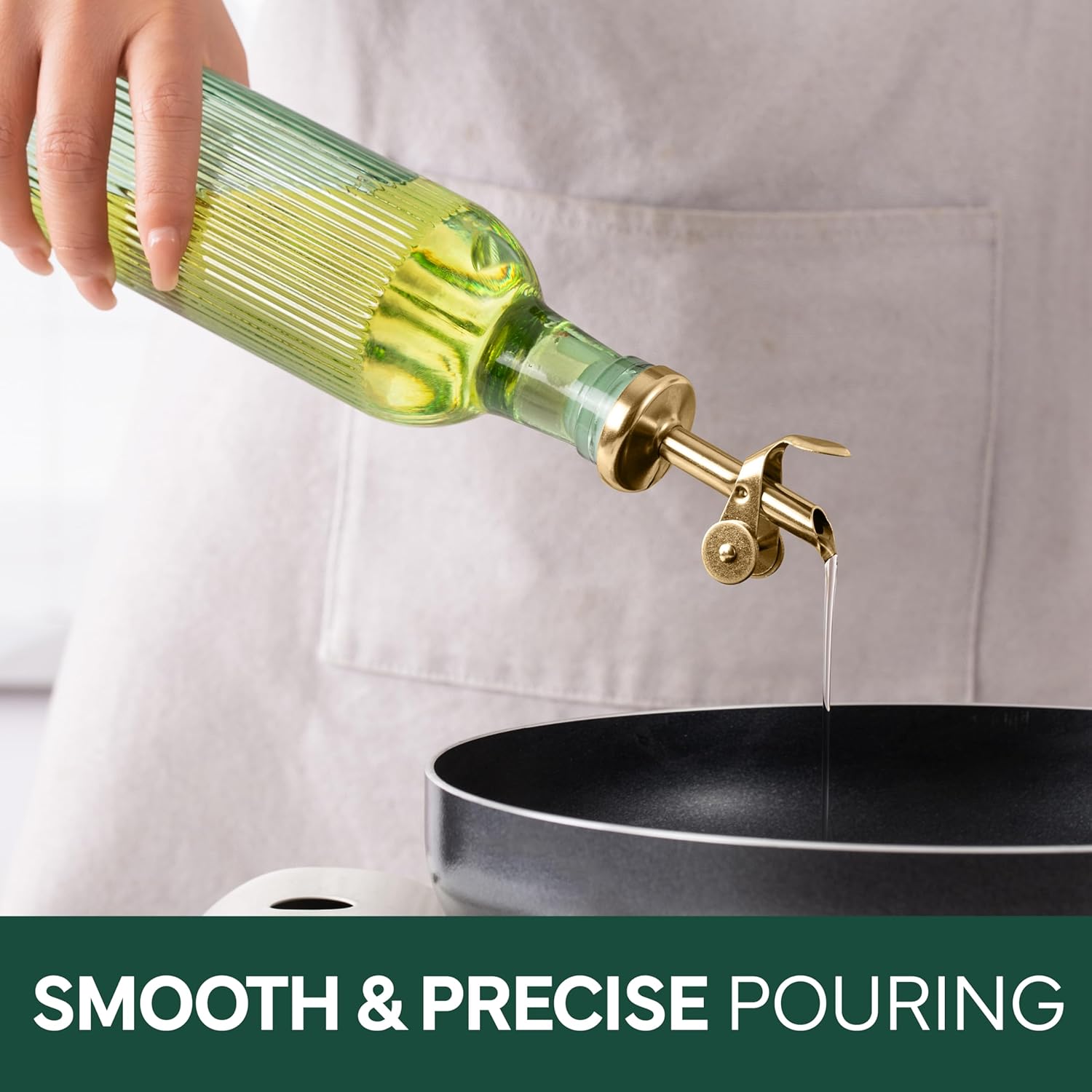 - Beautiful and Functional - Our colored glass oil dispensing bottles, with elegeant colors, gold tops and gold wire rack, will elevate your kitchen. Don't use just any oil bottle, upgrade the way you cook. That's our mission.