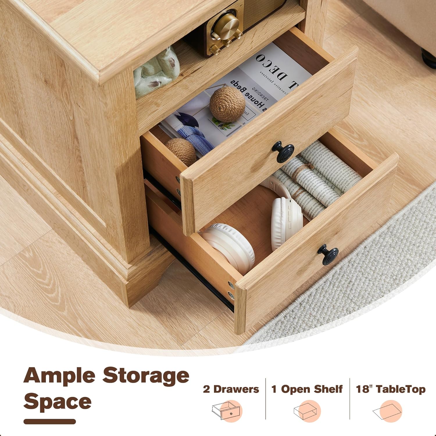 - Spacious Storage - Keep your essentials organized and easily accessible with twosliding drawers and an open shelf. The smooth gliding wheels ensure that thedrawers open and close smoothly every time. The tabletop is also perfect for matching various styles of table lamps.