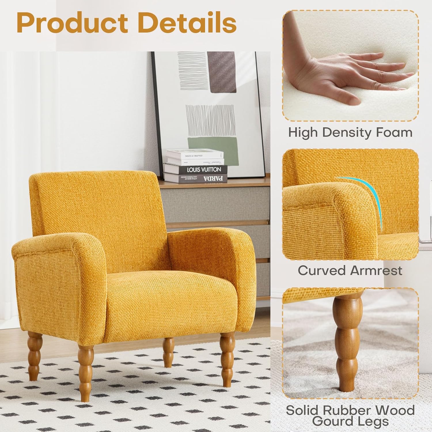 Chenille Fabric Accent Chair, Upholstered Armchair with Solid Wood Legs, Modern Living Room Accent Chair, Comfy Single Sofa Chair Reading Club Chair for Bedroom Reception Lounge, Yellow