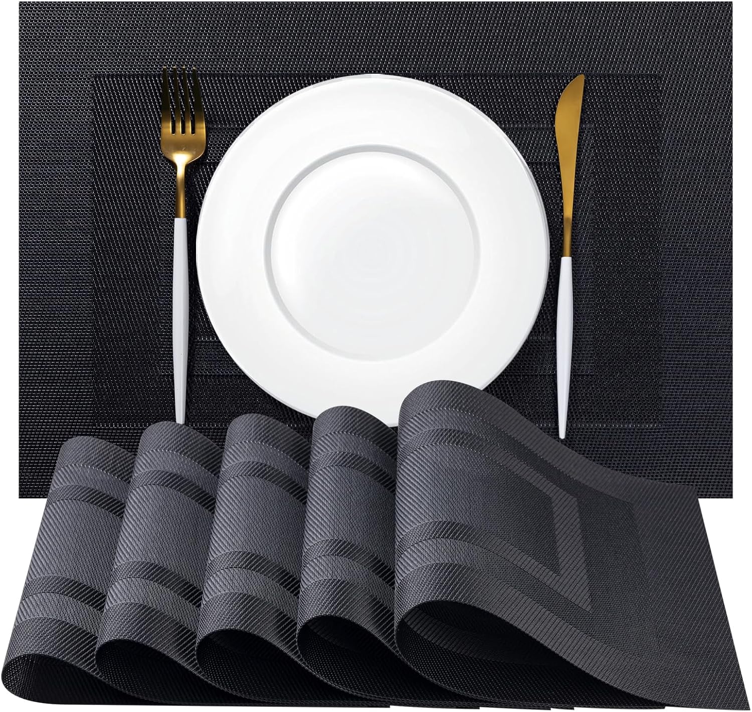 Placemats Set of 6 - Easy Clean Woven Vinyl Placemats for Dining Table, Indoor/Outdoor Place Mats, Washable PVC Table Mats(Black Cube)