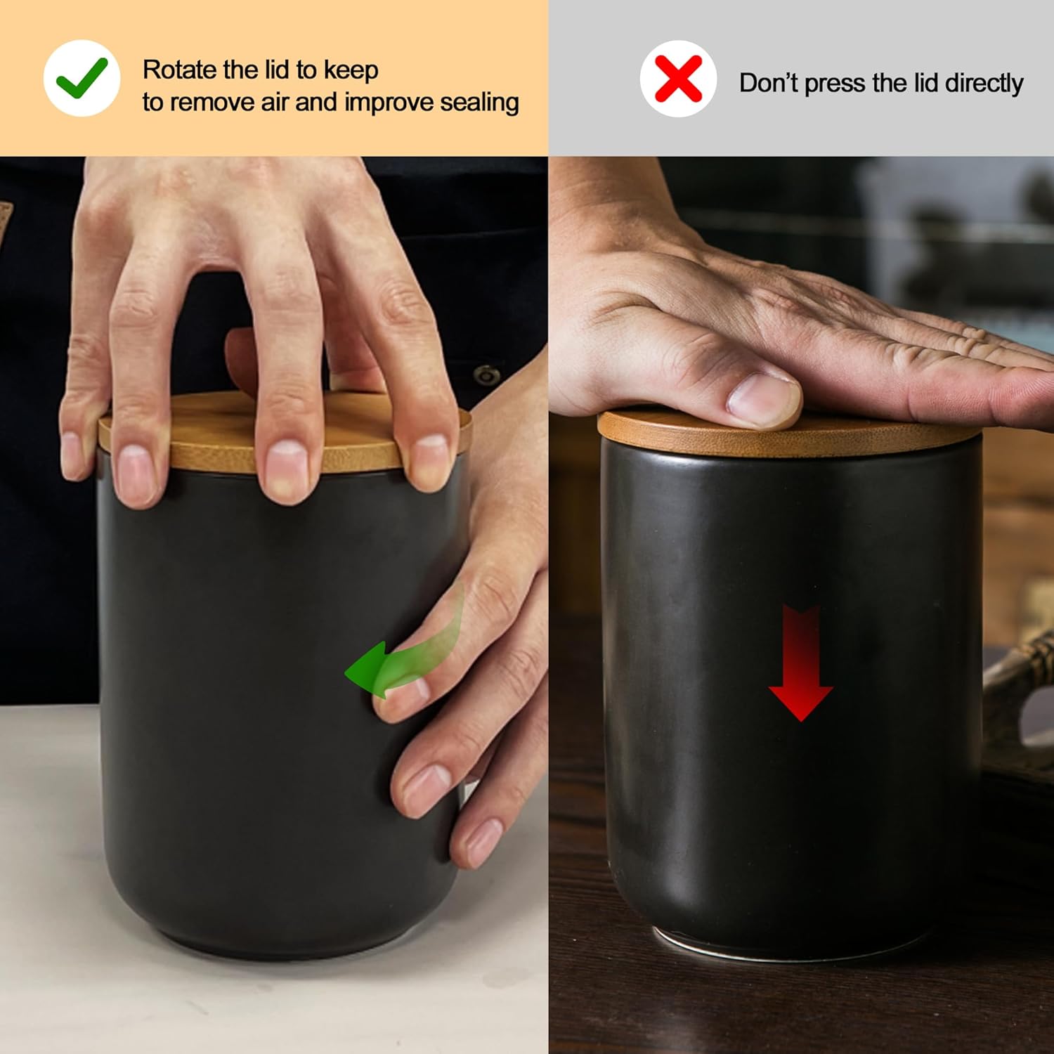 - Airtight Seal with Durable Wooden Lid - Each canister comes with a high-quality wooden lid and a silicone sealing ring, providing an airtight closure that keeps your ingredients fresh and dry. And the leather strap on top adds a functional touch for easy handling. To ensure the best seal, screw the lid tightly like turning a screw, effectively removing air and keeping your contents fresh. Please don't pressing down on the lid, it may not create a proper seal and could cause the rubber seal to pop out.