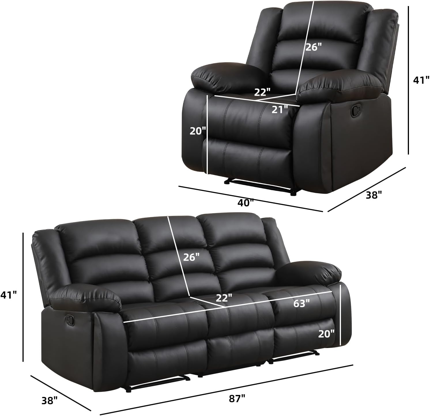 - 【Faux Leather Upholstery】The EBELLO recliner sofa set for living room is expertly upholstered in high-quality faux leather, designed to mimic the texture and appearance of genuine leather. Not only does it provide a luxurious aesthetic, but it also offers ease of maintenance. Faux leather is resistant to spills and stains, making it incredibly easy to clean and care for.