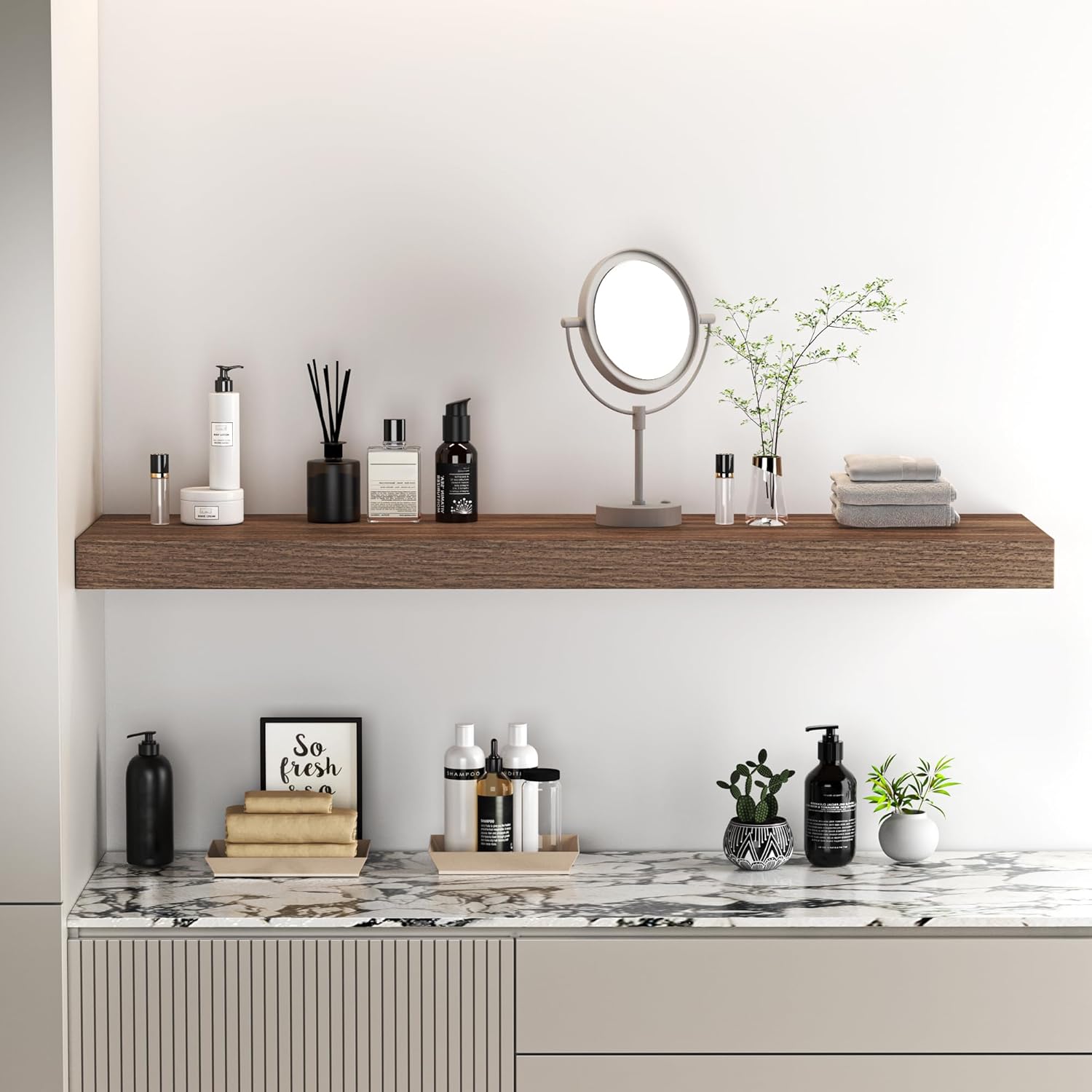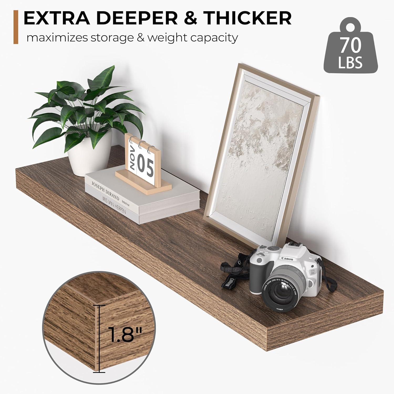 - Extra Deeper & Thicker - This wall shelf measures 36"W x 10.23"D x 1.8"H. Extra deeper and thicker design in order to bring maximizes storage space and weight capacity, even hold up to 70 lb. This floating shelf taking up zero square feet, reduces clutter and highlights décor in compact spaces.
