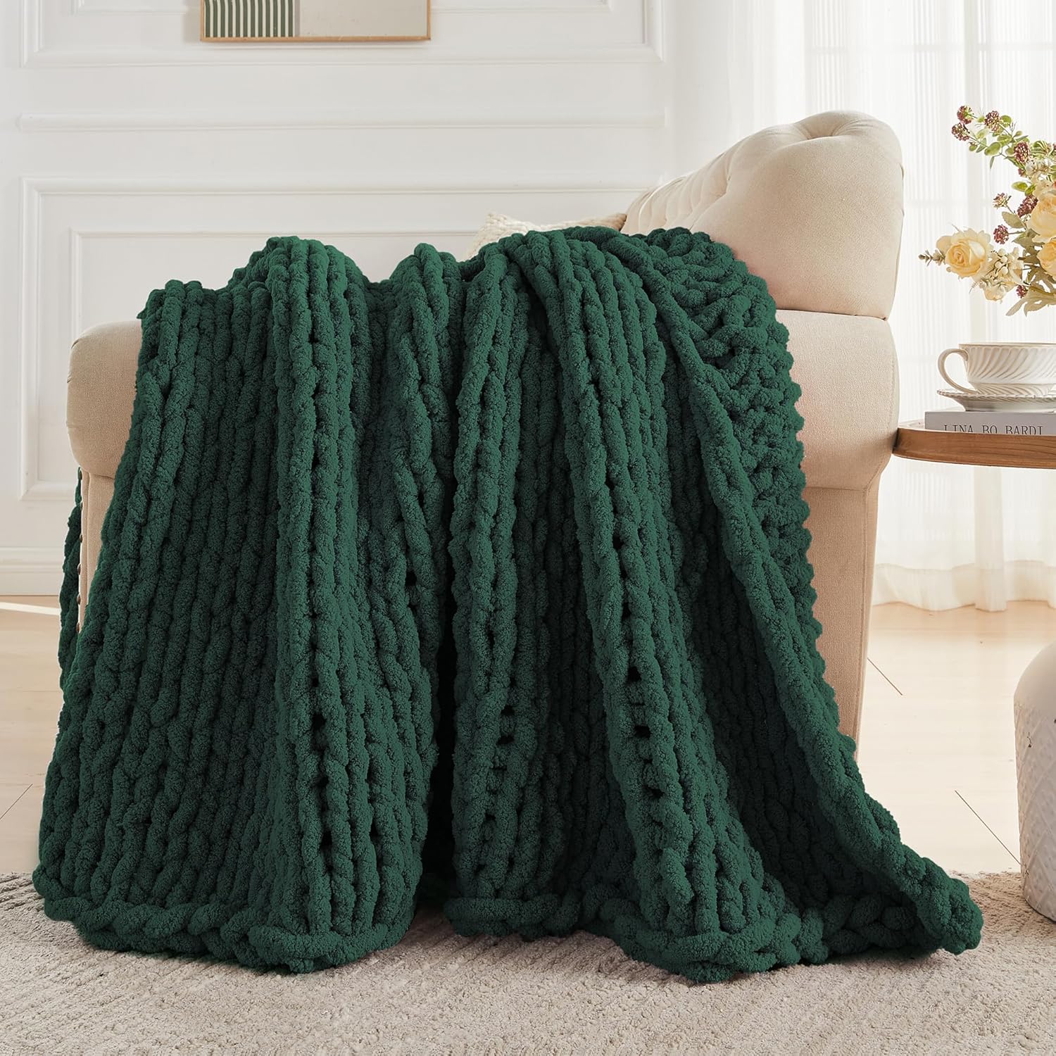 Carriediosa Chunky Knit Throw Blanket 60" X 80" Twin, 100% Hand Made Large Chenille Loop Yarn Soft Fluffy Throws for Couch Sofa Bed, Big Crochet Cozy Heavy Thick Cable Woven Blankets, Dark Green