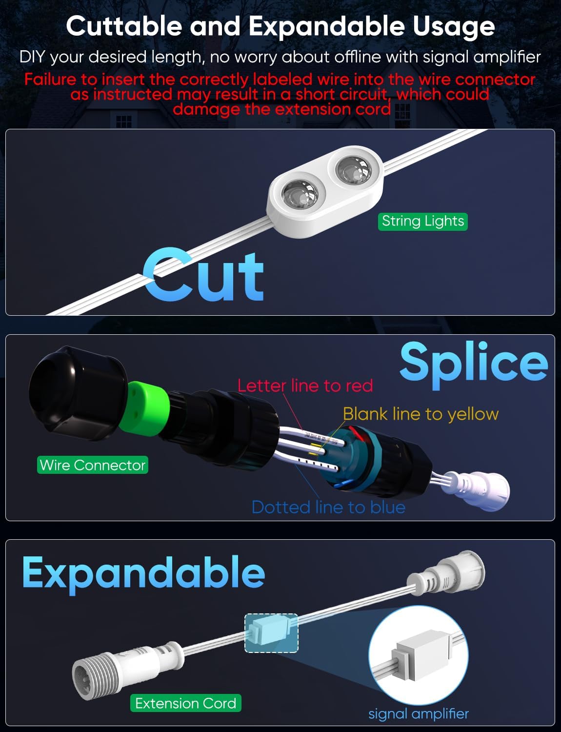 - Cuttable and Expandable: The outdoor permanent lights can be cut and extended by connecting an extension cord through wire connector set when specific area encountered. The extension cord can amplifiy the signal, up to 32.8ft/10m, ensuring that the whole lights set maintains a stable signal. If it is necessary to cut the light string, please refer to the installation guide for the correct installation method. (Failure to insert the correctly labeled wire into the wire connector as instructed may result in a short circuit, which could damage the extension cord with signal amplifier)
