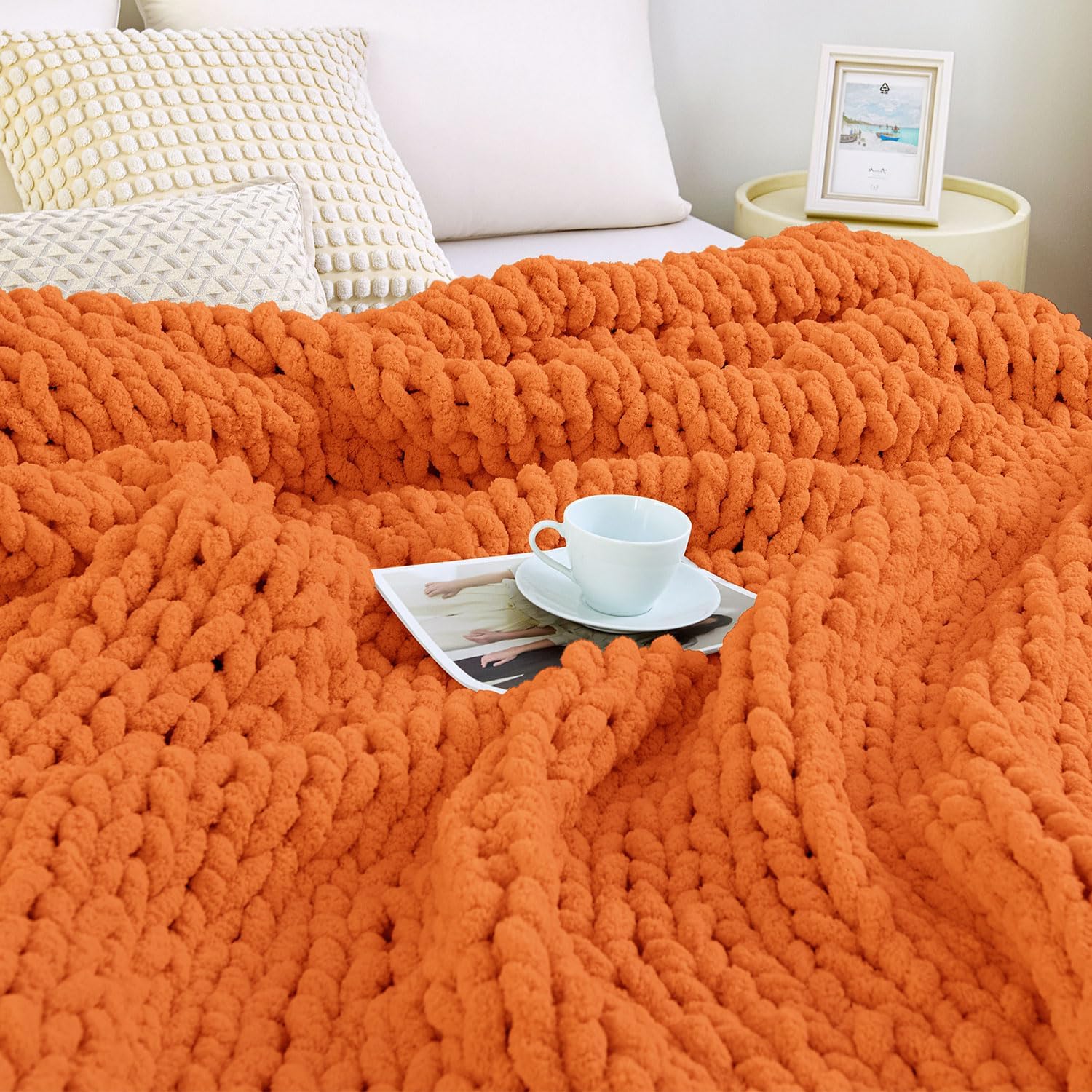 Admitrack Chunky Knit Blanket Throw, 100% Hand Knit Chenille Throw Blanket for Sofa & Home Decor, Soft and Cozy Knitted Throw Blankets (Orange, 51"x63")