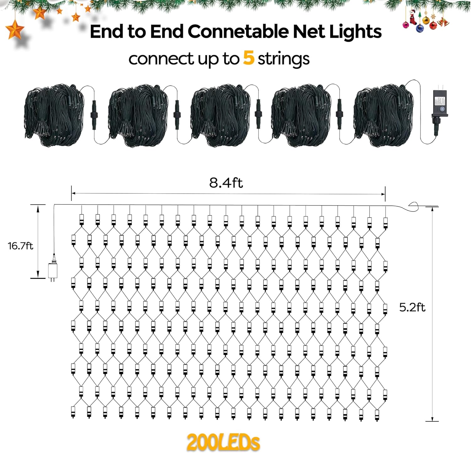 WBao Christmas Lights Outdoor, 200LED 8.4ft x 5.2ft Christmas Net Lights with 8 Modes, Timer, End to End Connectable, Waterproof LED Net Lights for Lawn, Bushes, Trees Xmas Decorations, Multicolor