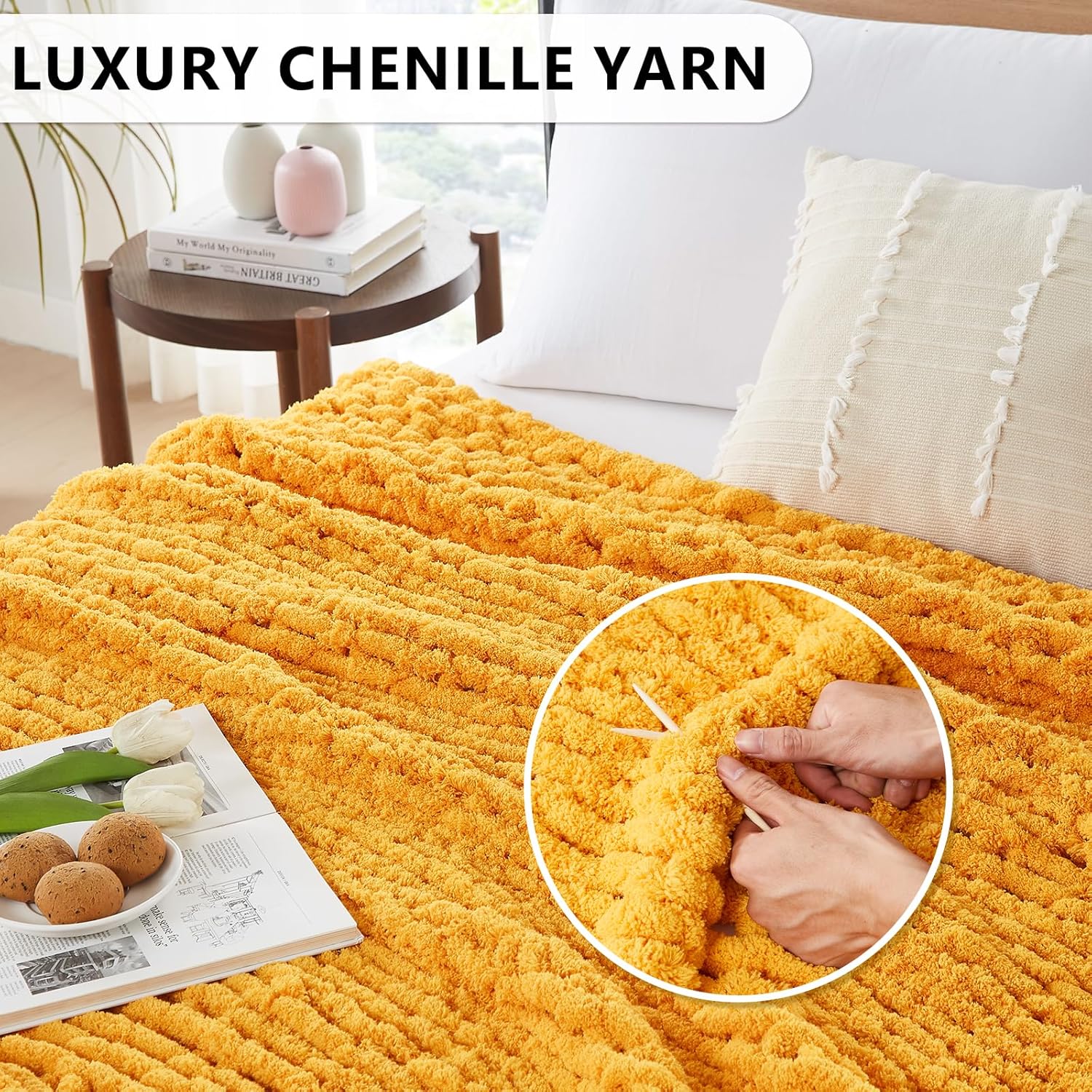 L'AGRATY Chunky Knit Blanket Throw: 72''x84'' Chenille Chunky Knitted Throw Blanket for Bed Couch - Handmade Thick Big Cable Knit Blanket - Large Chunky Crochet Rope Blanket for Home Decor(Yellow)