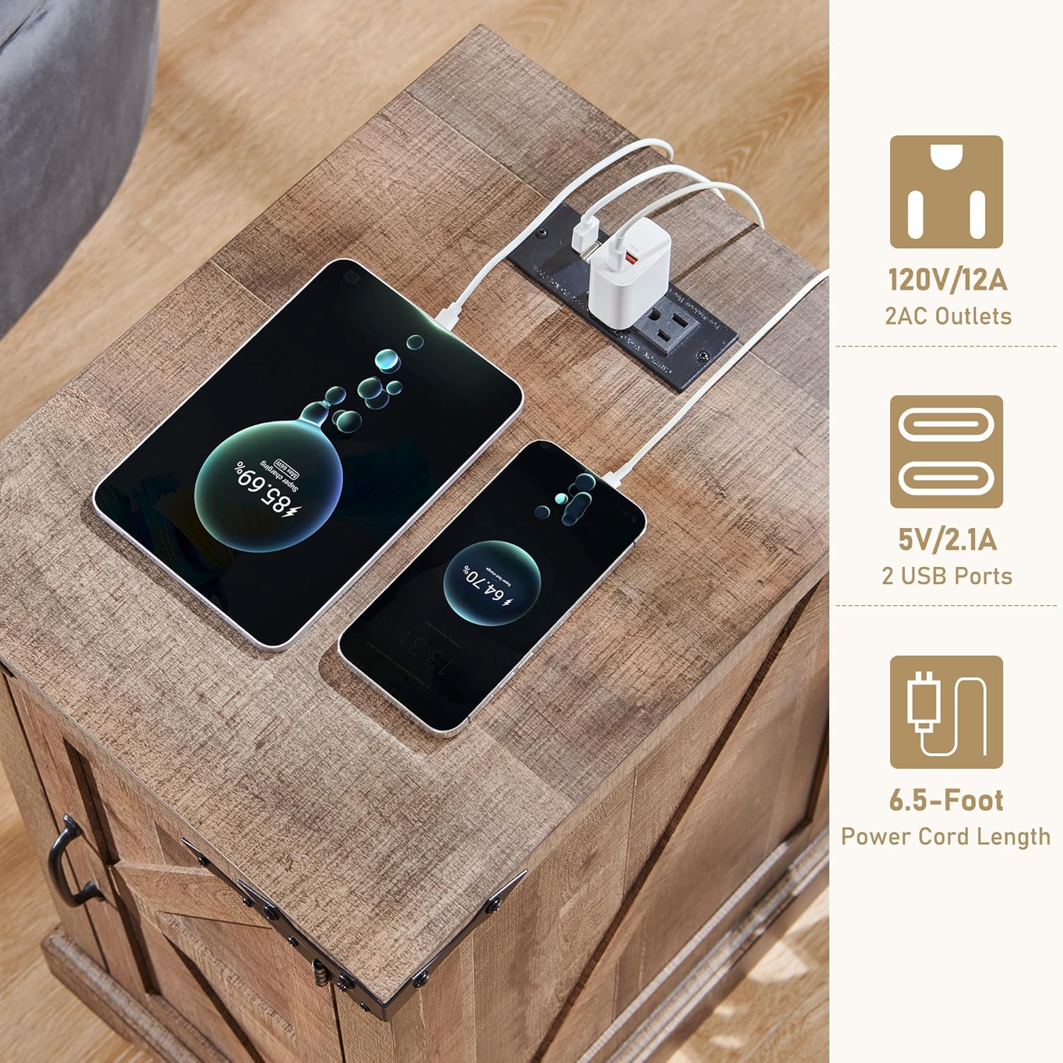 - CHARGING STATION TABLE: This end table with charging station is equipped with 2 Standard AC Outlets and 2 USB ports, with two 2.3"round holes at the back for organizing the cords, which makes the desk neater while providing convenience for charging your devices such as cell phones, tablets, and earphones. A great addition to your home, making your house more orderly