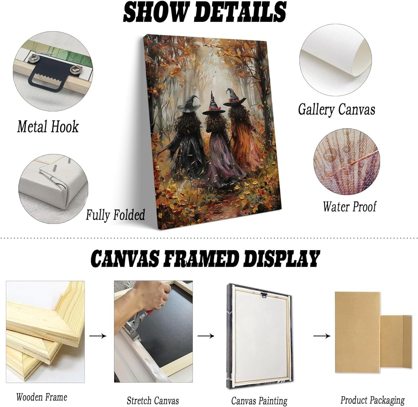Vintage Three Witches In The Forest Painting Witch Print Witchy Canvas Print Halloween Wall Art Halloween Decor Witch Poster Dark Academia Gothic Room Decor for Bedroom 16x24in Large Frame wall art