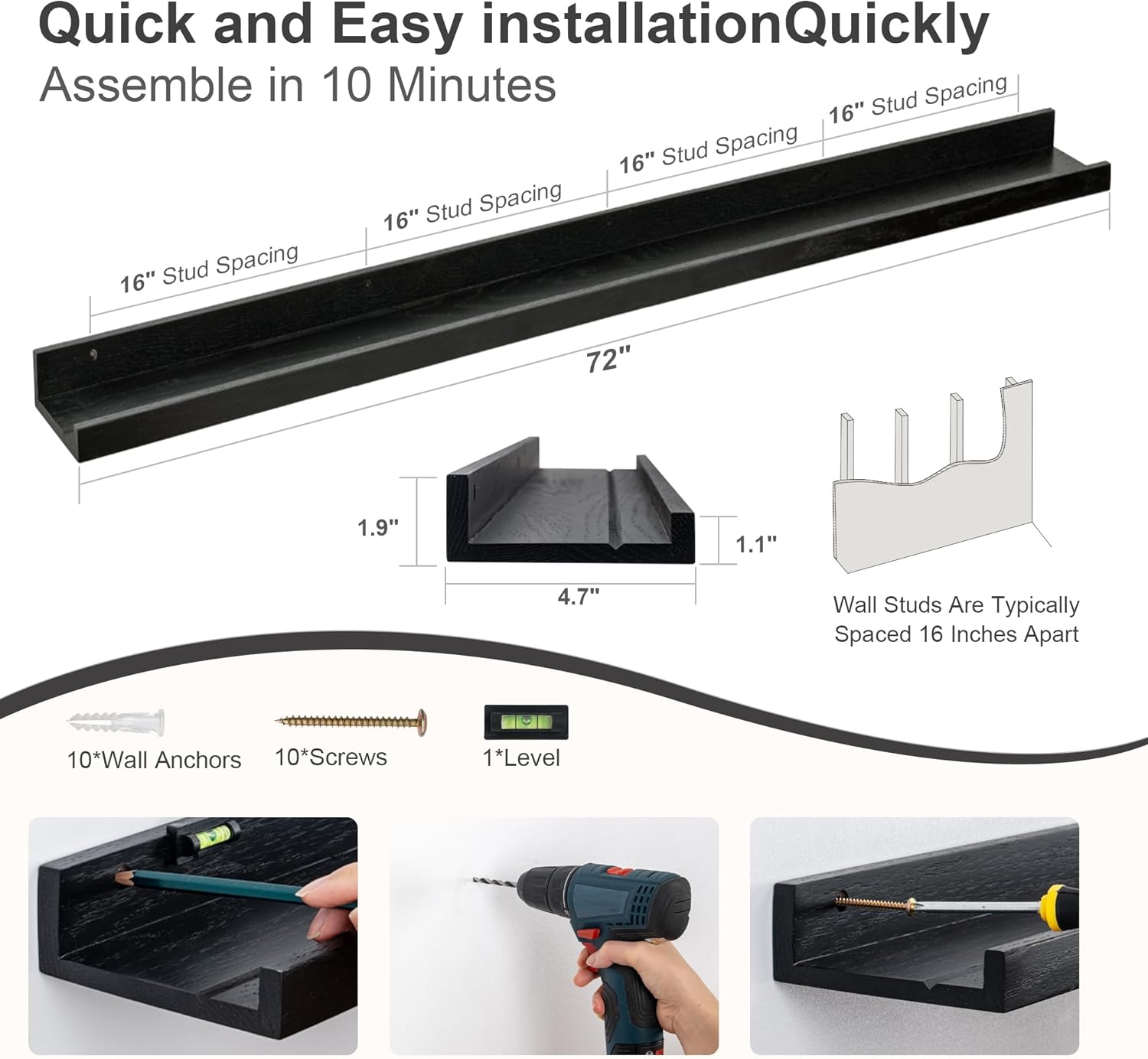 Floating Picture Ledge Shelves 72 Inch Solid Oak Wood Set of 2, Rustic Wall Storage Shelves with Lip, Kids Bookshelf, Photo & Picture Ledge Shelves for Bedroom, Living Room, Kitchen