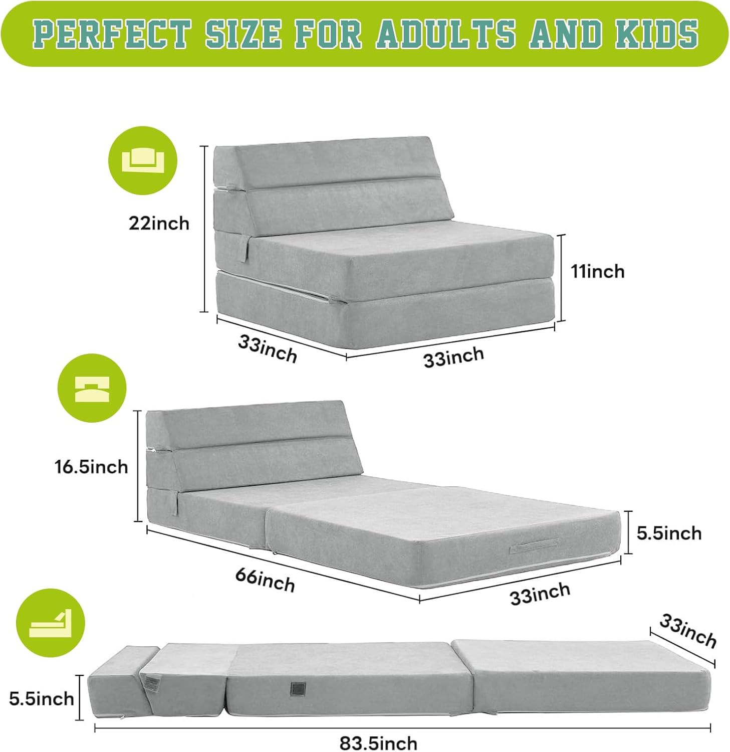 - Larger Convertible Sleeper Chair: Our convertible sofa bed size is 83"x33"x5.5", which is thicker and longer than other folding sofa bed sizes, even for adults to relax, or sleep comfortably on this futon sofa bed furniture piece. Meanwhile, Our foldable sofa bed features with Velcro fastening design, ensuring it stays firmly in place during use.