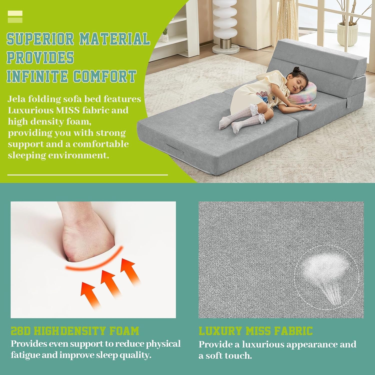jela Foldable Sofa Bed Soft Foam Convertible Sleeper Chair Luxury Miss Fabric Fold Out Chair Bed Floor Couch with Back Support Floor Sofa for Living Room Bedroom (83"x33",Light Grey)