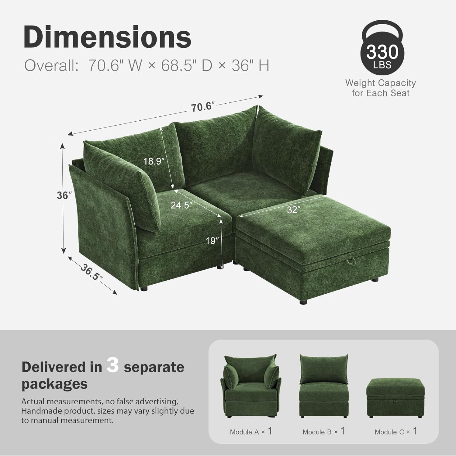 - 💡 Stylish and Spacious Sectional Sofa - A blend of modern elegance and comfort, this green sofa is ideal for contemporary interiors. Customize seating and shape by adding or removing modules to fit your needs. It's perfect for your living room, family room, bedroom, or office. Overall size: 70.6" W × 68.5" D × 36" H, seat width: 32", seat depth: 24.5".