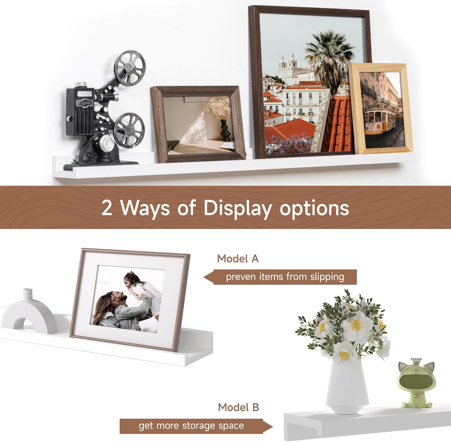 - MEMORIES SHOWCASE SHELF: Do you have a lot of memorable photos, but don't know how to display them, Fun Memories picture ledge shelves (especially in large sizes) are perfect for you to display them! With our hanging racks, you can store and display different types and sizes of photo frames in one place without worrying about