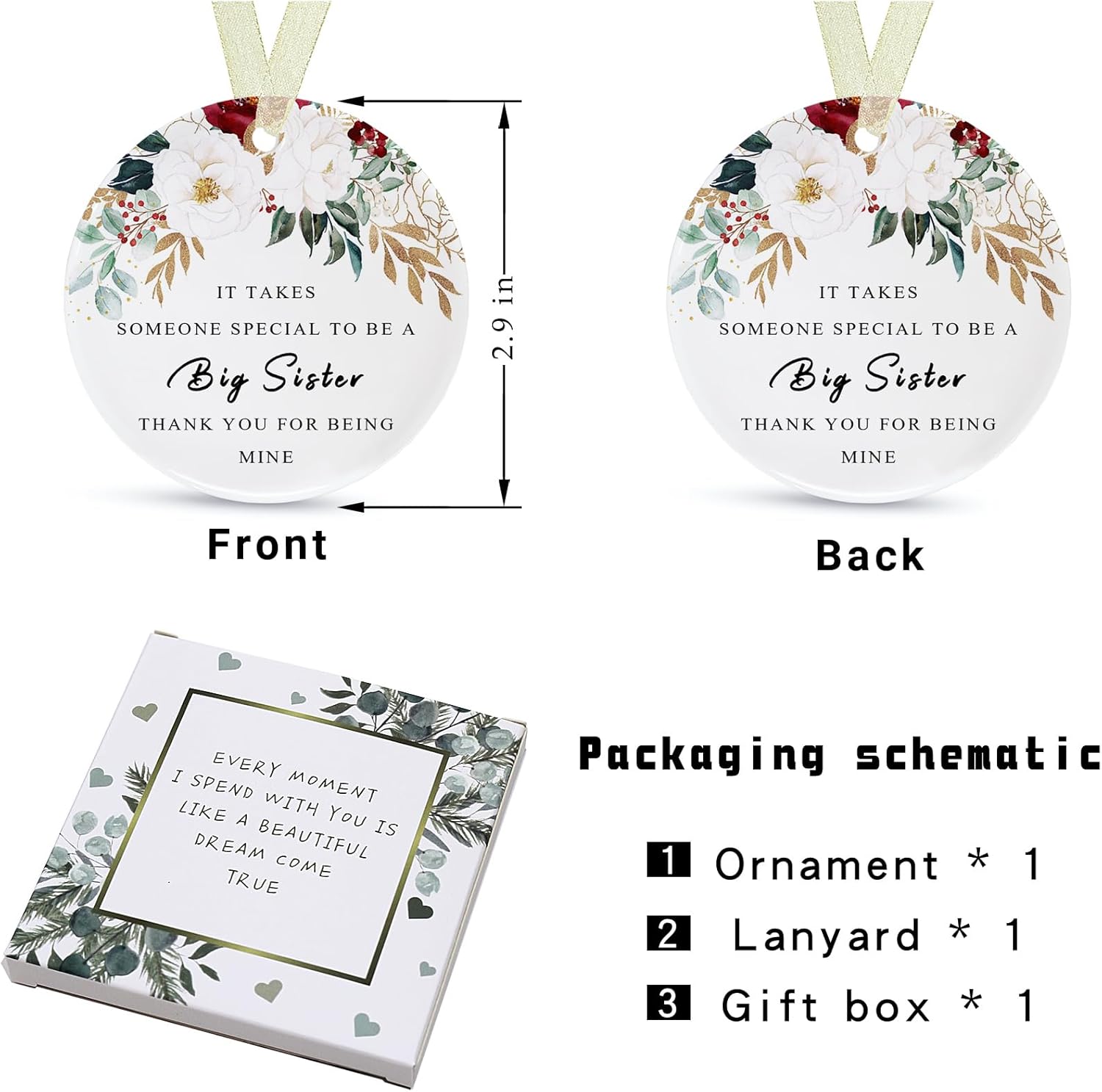 - 🌼【Perfect and delicate size】This is a sister memory ornament with a diameter of 2.9 inches and a thickness of only 0.18 inches. The product includes: a round sis ornamentt*1, a gift box*1 and a lanyard*1. The gift box comes with it makes it easy for you to give the best sis ever gifts directly to family and friends and other special people in your life, and the lanyard that comes with it helps to hang it easily on the Christmas tree or anywhere you want.