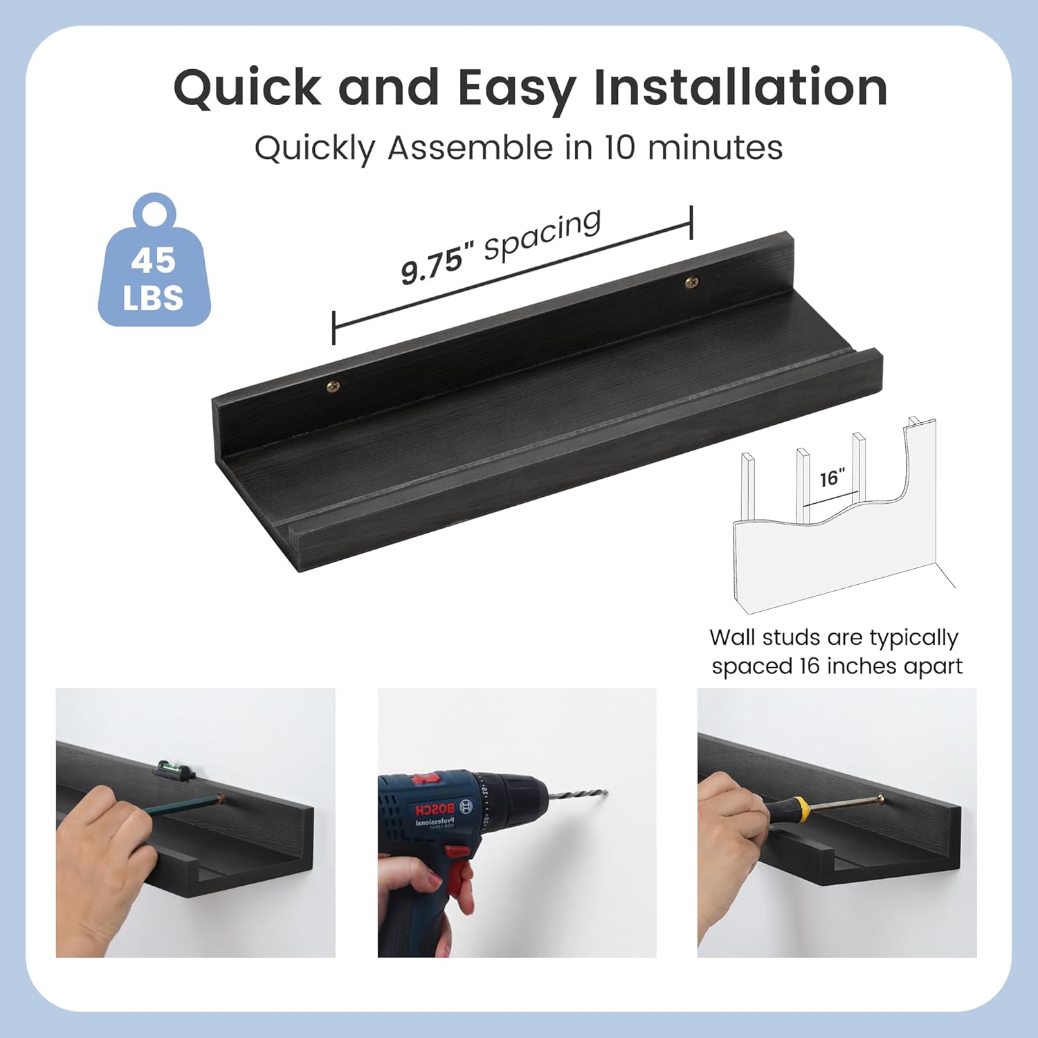 - Easy to Install: You will get a level, screws for the wall, drywall anchors, a detailed installation guide, and two beautiful hand-crafted solid pine wood shelves. With the level, you can make sure your picture ledge shelves are well aligned. Just follow the simple instruction to install the hanging shelves for wall decor within 10 minutes. We add additional screw and anchor to the hardware bag just in case. If you have any questions about our products, please feel free to contact us